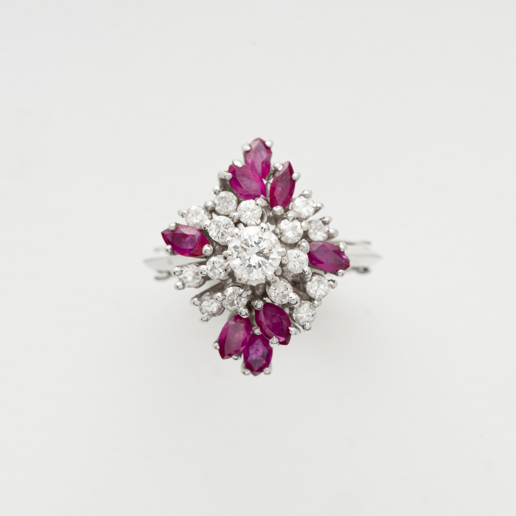 Sortija en oro blanco con diamantes talla brillante y rubíes talla marquise engastados en garras.