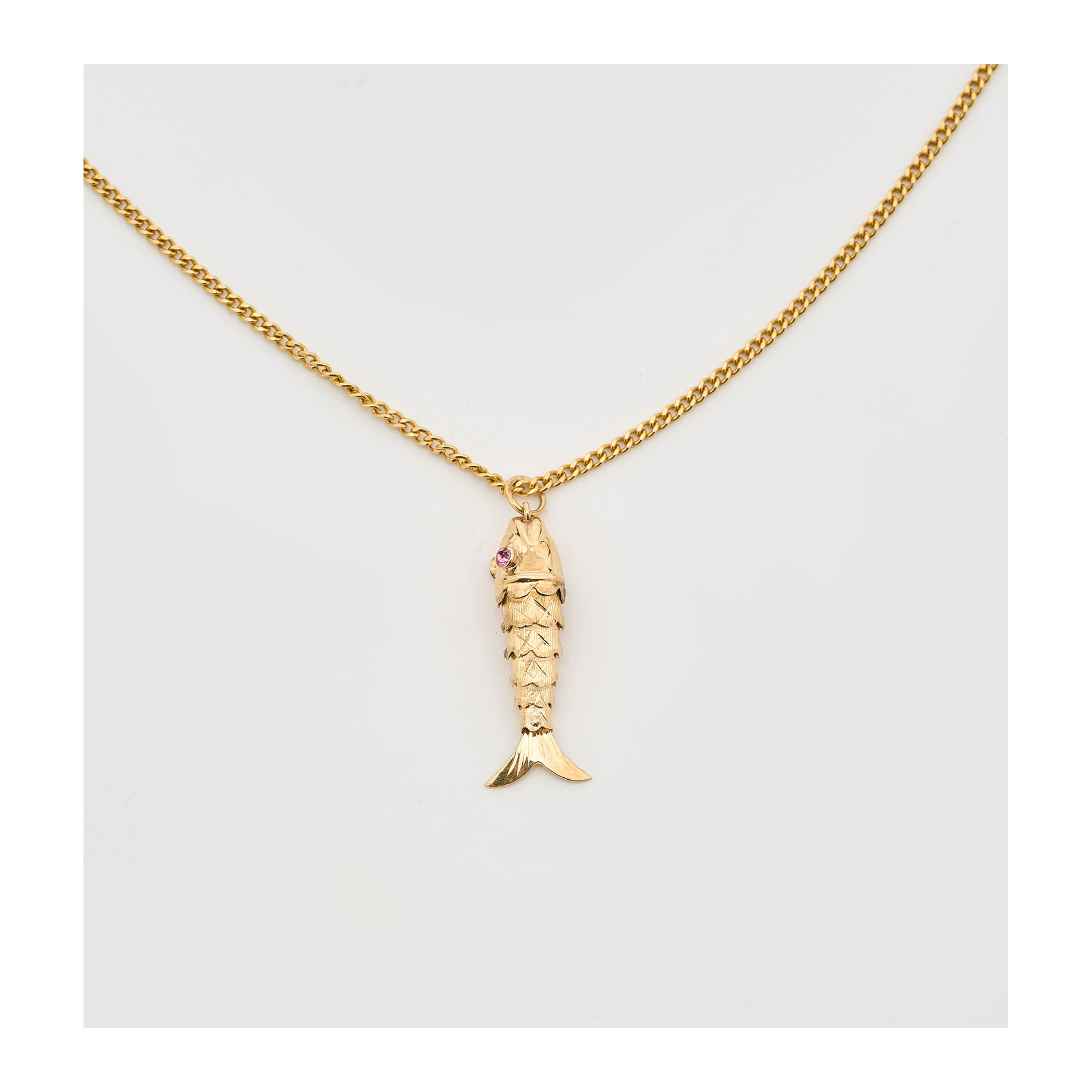 Cadena barbada con colgante diseño pez de 3 cm.en oro y dos circonitas rosas.