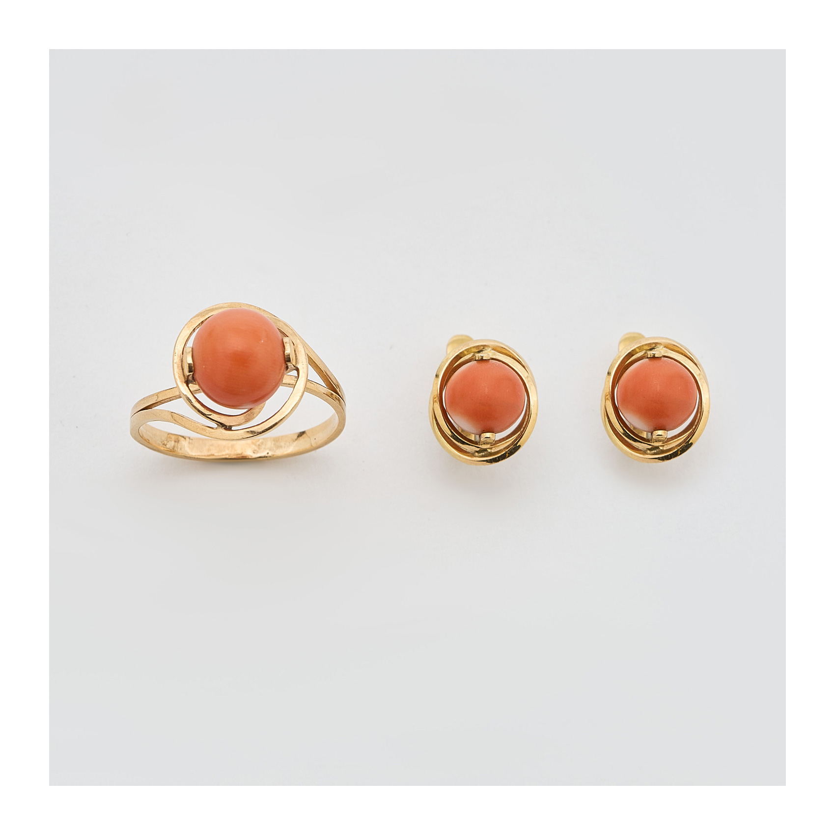 Juego de pendientes y sortija en oro con cuentas de coral de 7 y 9,5 mm.