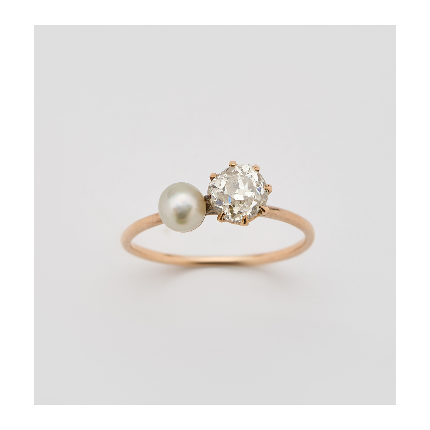 Sortija tu y yo en oro con perla cultivada de 5 mm. y diamante talla brillante antigua.