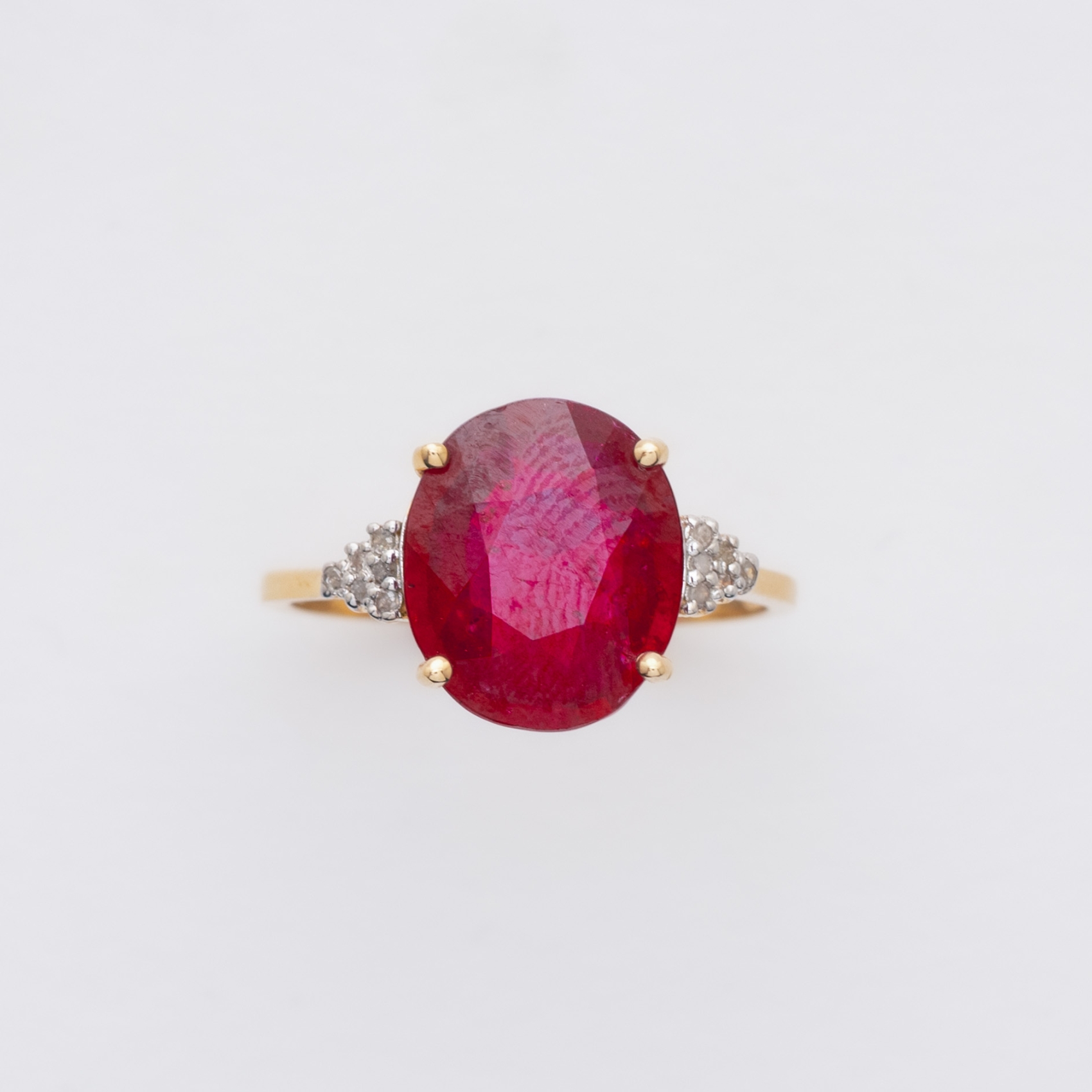 Sortija en oro de 14 ct., con rubí central custodiado por de diamantes talla brillante.