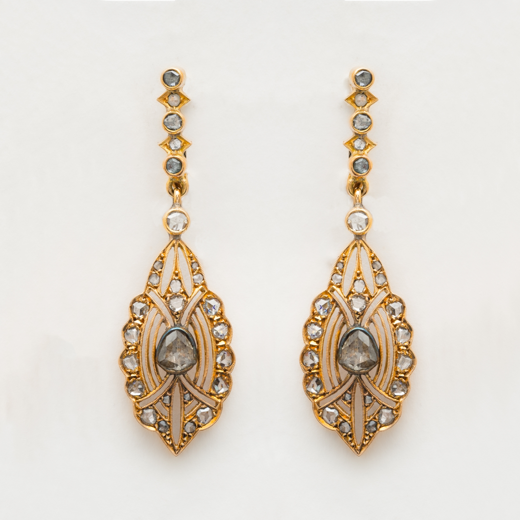 Pendientes largos en oro 14K con decoración calada y diamantes talla rosa. fles.s.XIX.