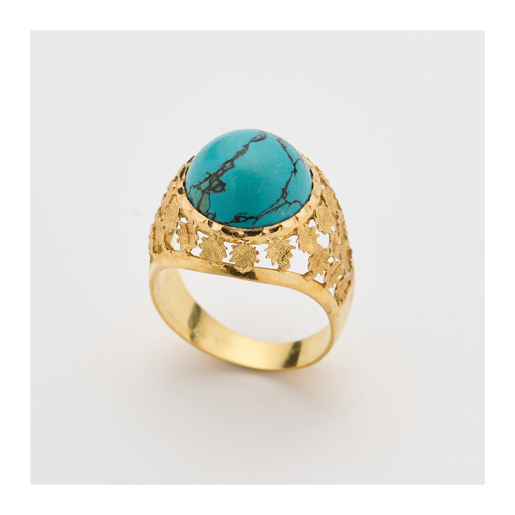 Sortija en oro mate y brillo con calado floral y cabujón redondo de turquesa de 12 mm. engastado en chatón.