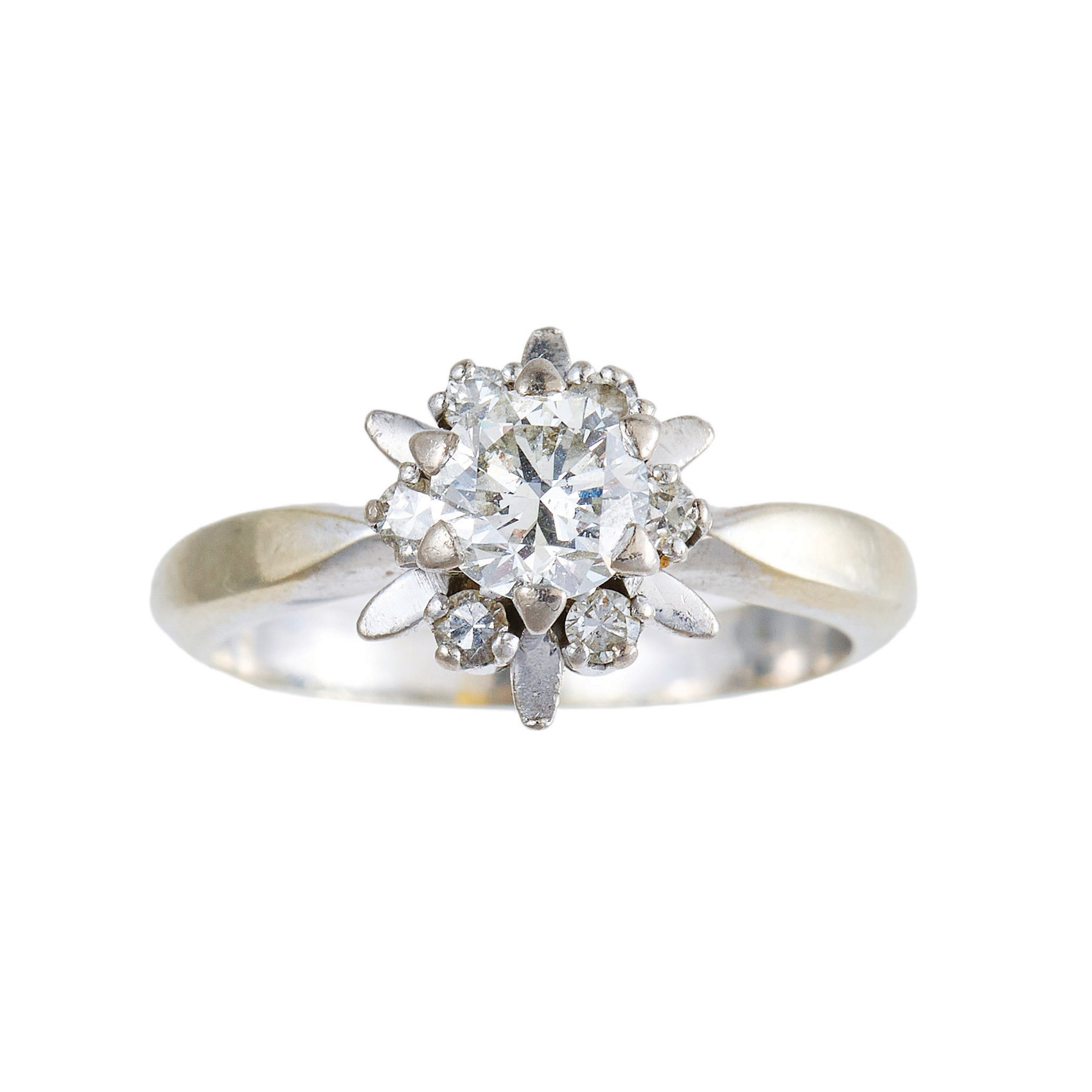 Sortija rosetón en oro blanco con diamantes talla brillante engastados en garras.