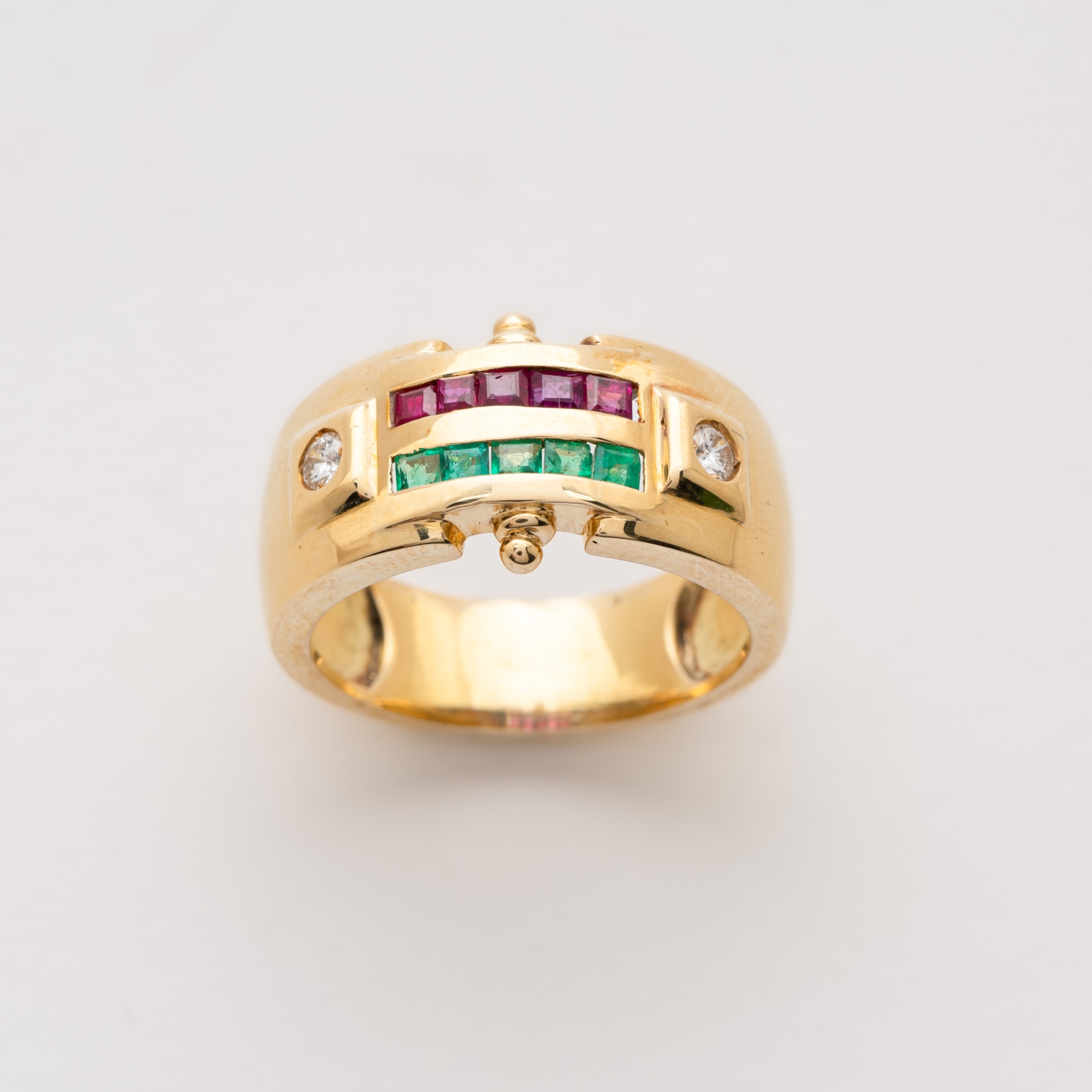 Sortija en oro con dos hileras de rubíes y esmeraldas calibradas rematado con dos diamantes talla brillantes.