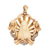 Medalla devocional en oro y vistas en platino con representación de Virgen en marfilina y diamantes talla rosa 3/3, c.1940. 3,5 x 2,8 cm. Peso diamantes: 0,04 ct. aprox. Peso total: 4,8 gr. Estimación: 400 – 550 €.