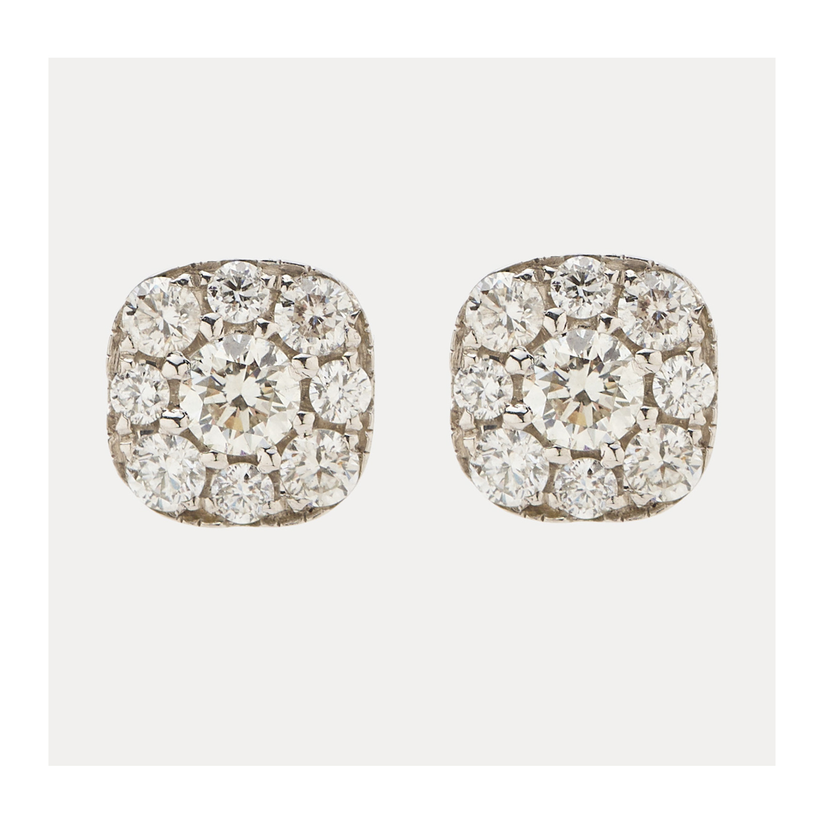 Pendientes rosetón diseño cuadrangular en oro blanco con diamantes talla brillante engastados en garras.