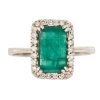 Sotija rosetón en oro blanco con esmeralda central orlada por diamantes talla brillante. Peso diamantes: 0,25 ct. aprox. Peso esmeralda: 1,40 ct. aprox. Peso total: 3,5 gr. Medida: Nº 13. Estimación: 1200 – 1600 €.