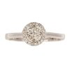 Sortija en oro blanco con rosetón y orla de diamantes talla brillante engastados en garras. Peso diamantes: 0,22 ct. aprox. Peso total: 3 gr. Medida: Nº 13. Estimación: 1200 – 1600 €.