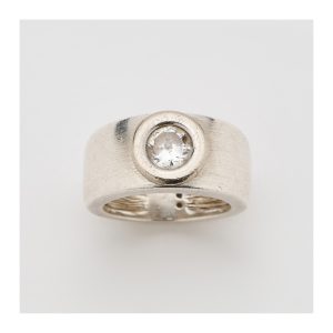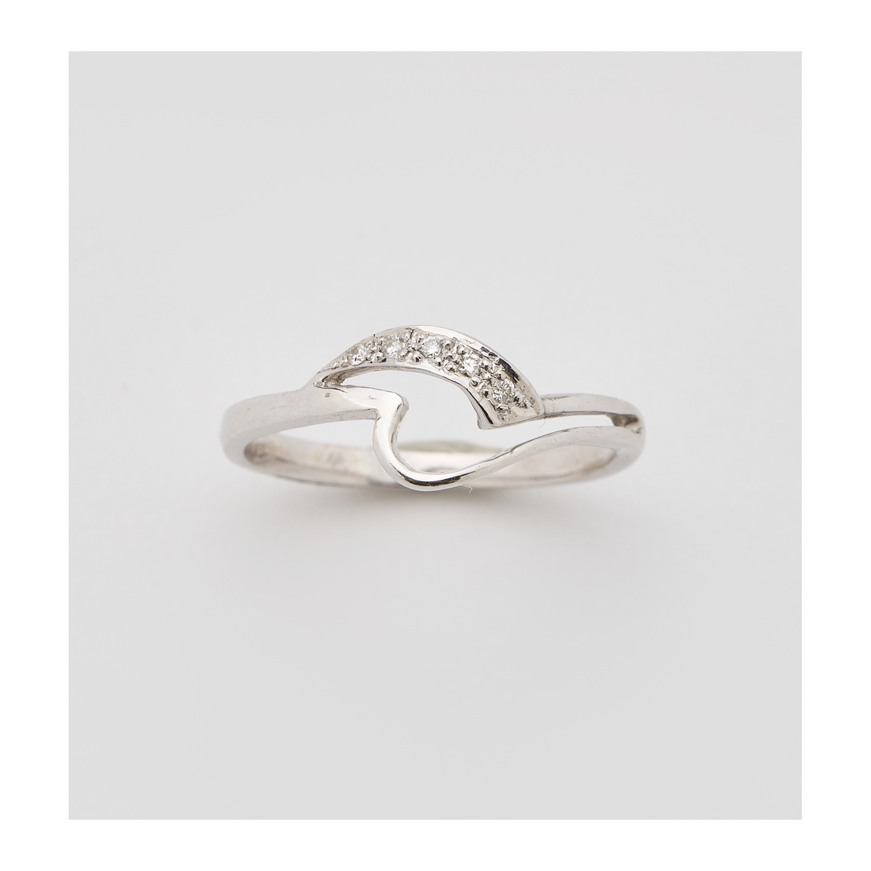 Sortija en oro blanco con centro calado y banda de pavé de diamantes talla brillante.