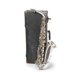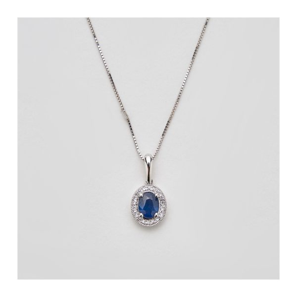Colgante rosetón en oro blanco con zafiro azul talla oval orlado por diamantes talla brillante.