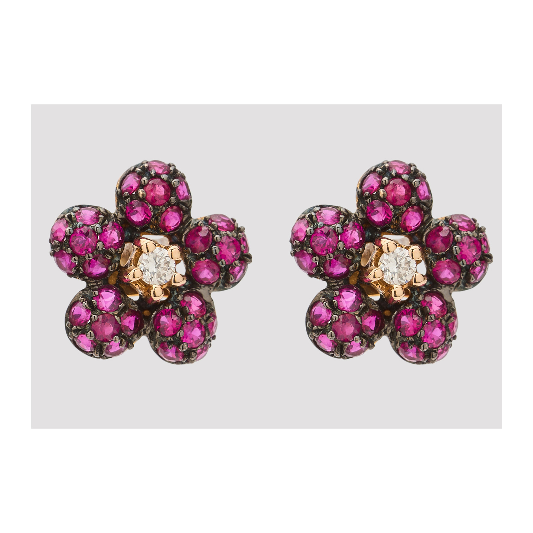 Pendientes diseño flor en oro amarillo y pavonado con diamante central talla brillante y pétalos de rubí talla redonda.
