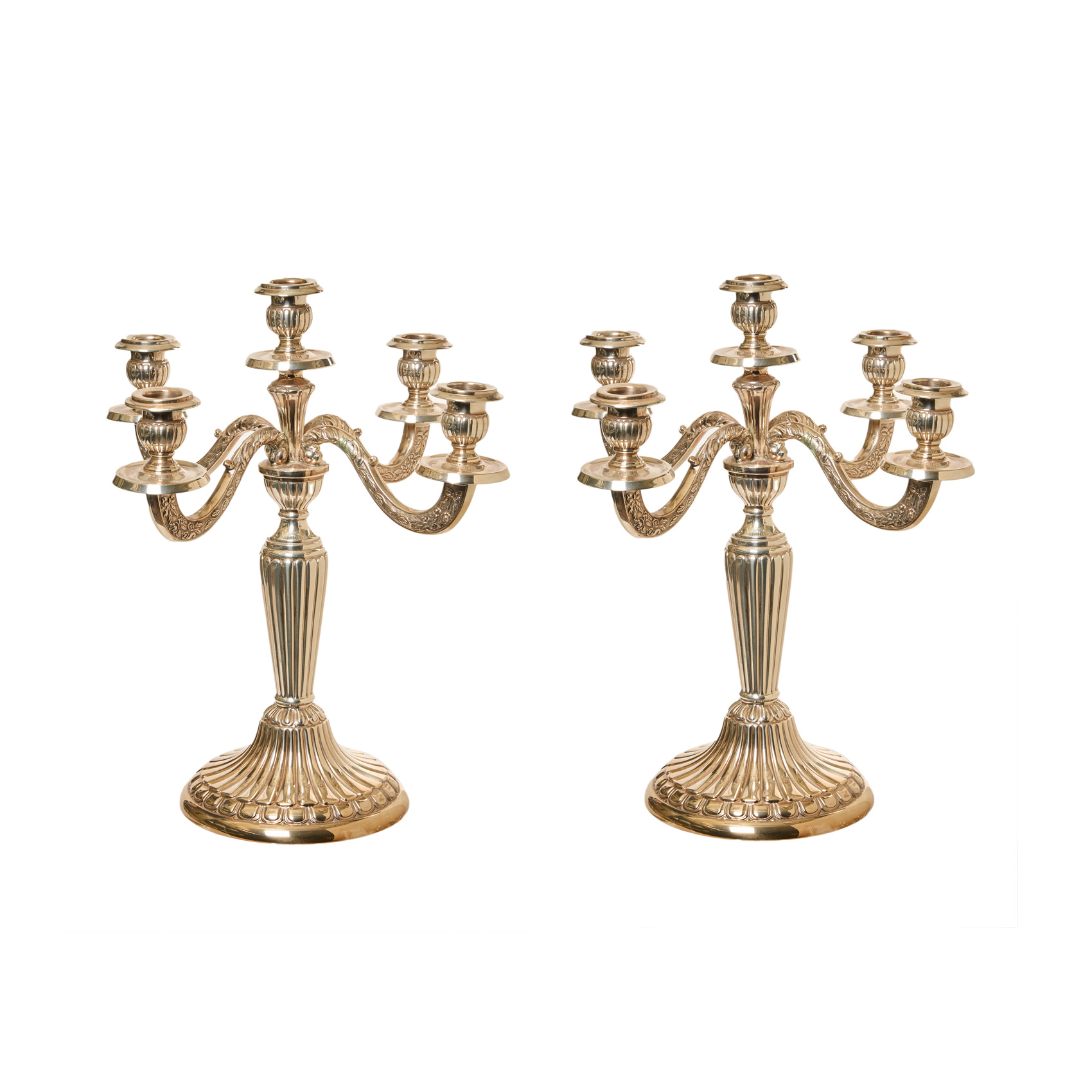 Pareja de candelabros de cinco luces en plata española punzonada 916, s.XX. Base, fuste y portavelas gallonados con brazos en voluta y motivos florales.