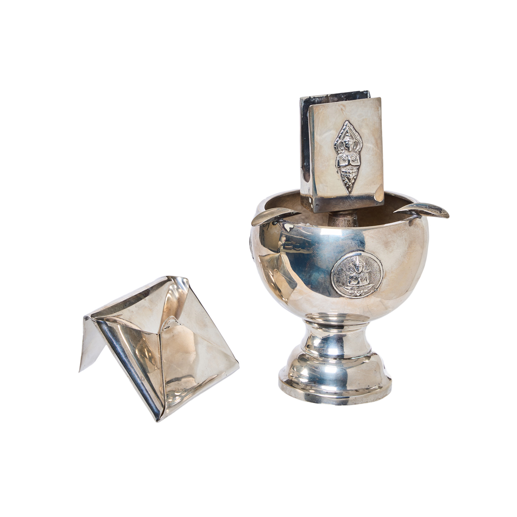 Cenicero con soporte para cerillas y tarjetero en plata punzonada 925, s.XX. Tarjetero en forma de sobre y cenicero con decoraciones de divinidades orientales.