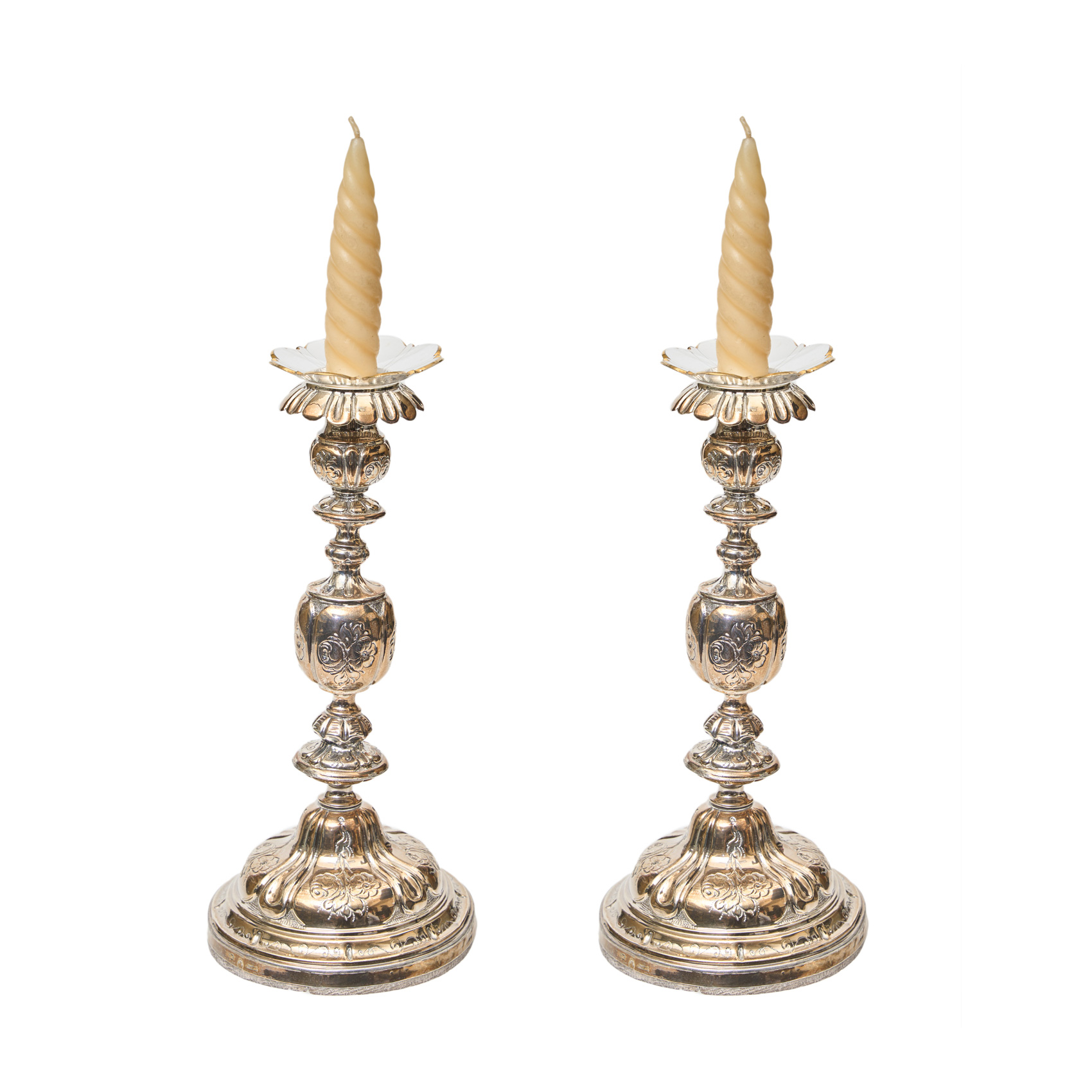 Pareja de candeleros estilo barroco en plata española punzonada con decoración floral incisa, ppios. del s.XX. Con contrastes de la localidad de Barcelona, fiel contraste B y R y platero Cavallé. Presentan portavelas en vidrio.