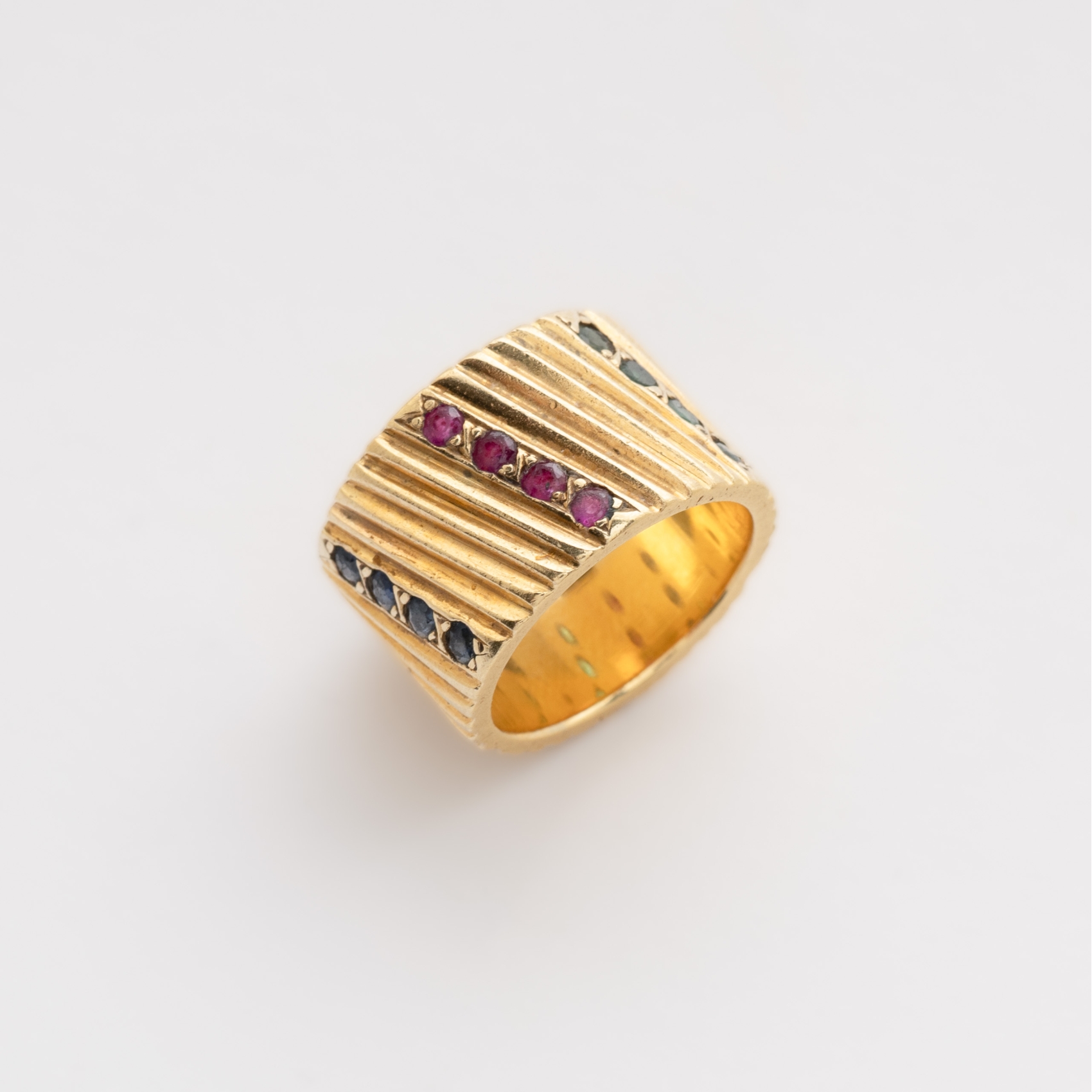 Sortija gallonada en oro con tres bandas centrales de esmeraldas, rubíes y zafiros azules talla redonda.