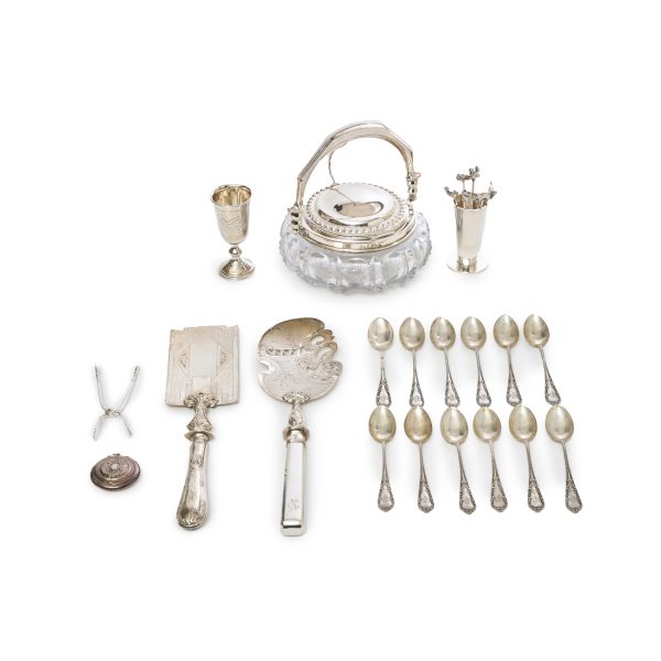 Lote de 23 piezas en plata punzonada y azucarera en cristal tallado y plata. Compuesto por dos copitas, seis palillos condecraciones de animales, una polvera, doce cucharas de moka, unas pinzas de servir y dos palas de servir tarta.