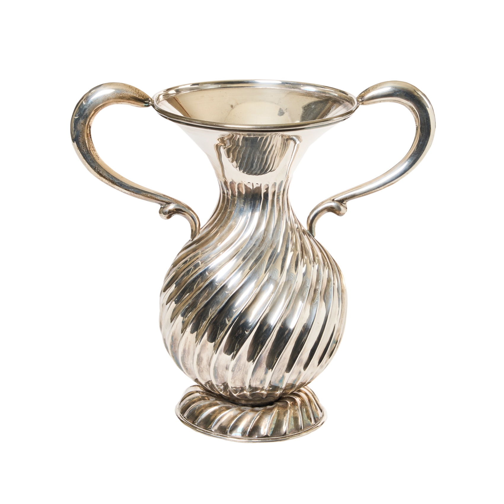 Jarra con dos asas en plata española punzonada decorada por gallones oblícuos, s.XX.