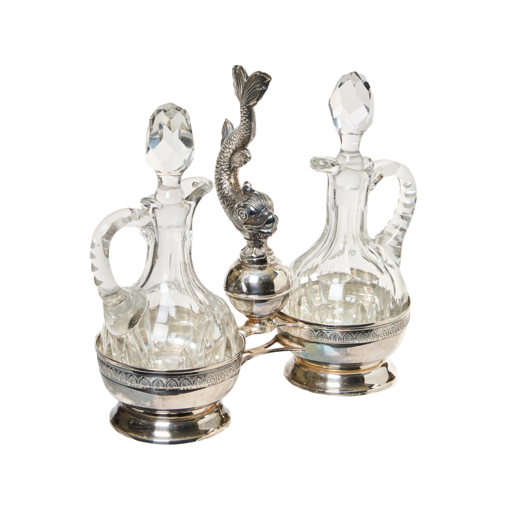Convoy en plata española punzonada con representación clásica de delfín al centro y pequeña greca de palmetas, s.XX. Vinajeras en cristal tallado.