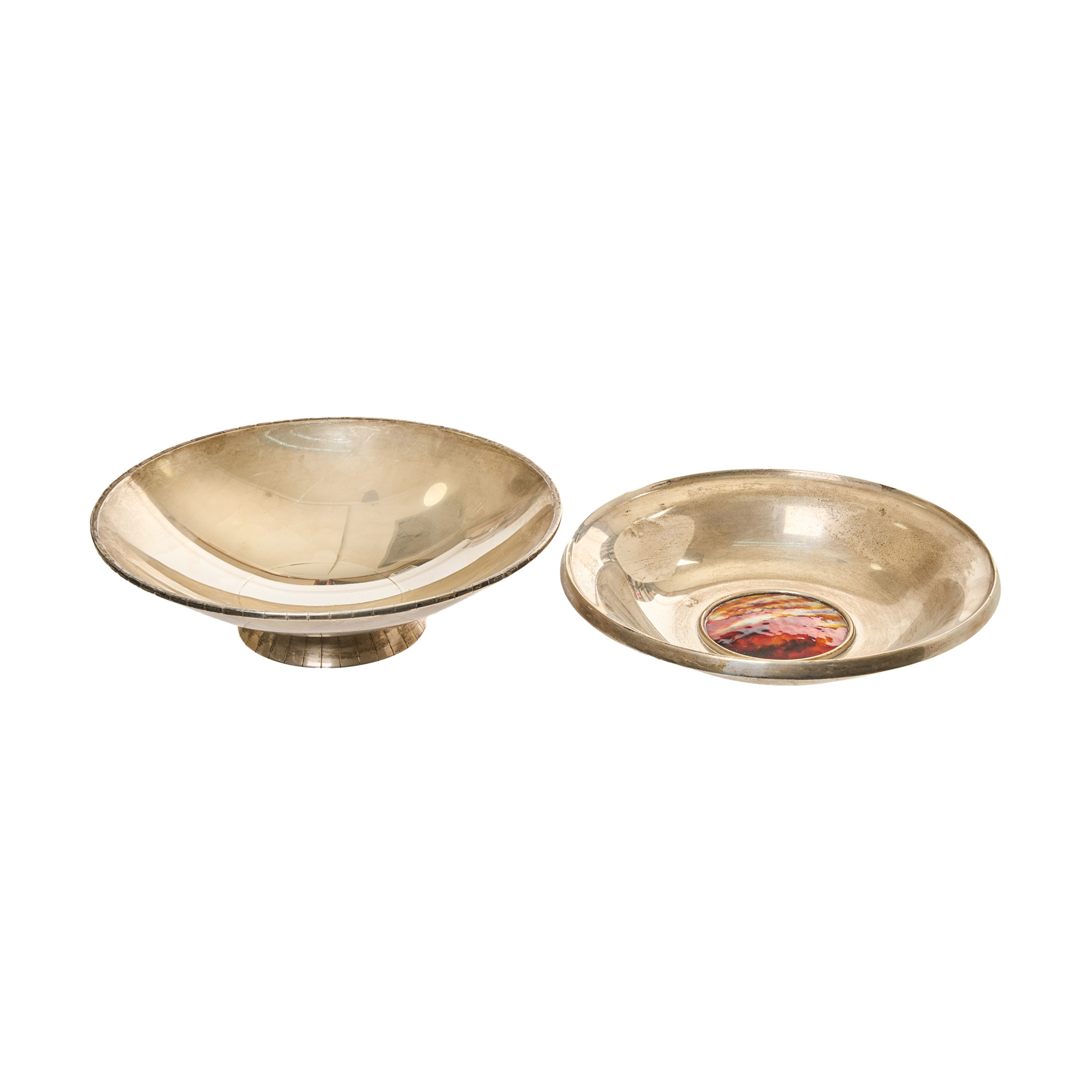 Pareja de centros en plata española punzonada con decoraciones lisas, s.XX. Uno con asiento esmaltado en tonos anaranjados.