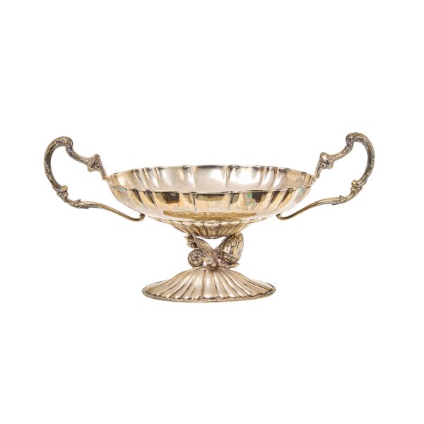 Centro en plata española punzonada con base gallonada y fuste en forma de bellota, s.XX. Base de perfil polilobulado con asas de roleos.