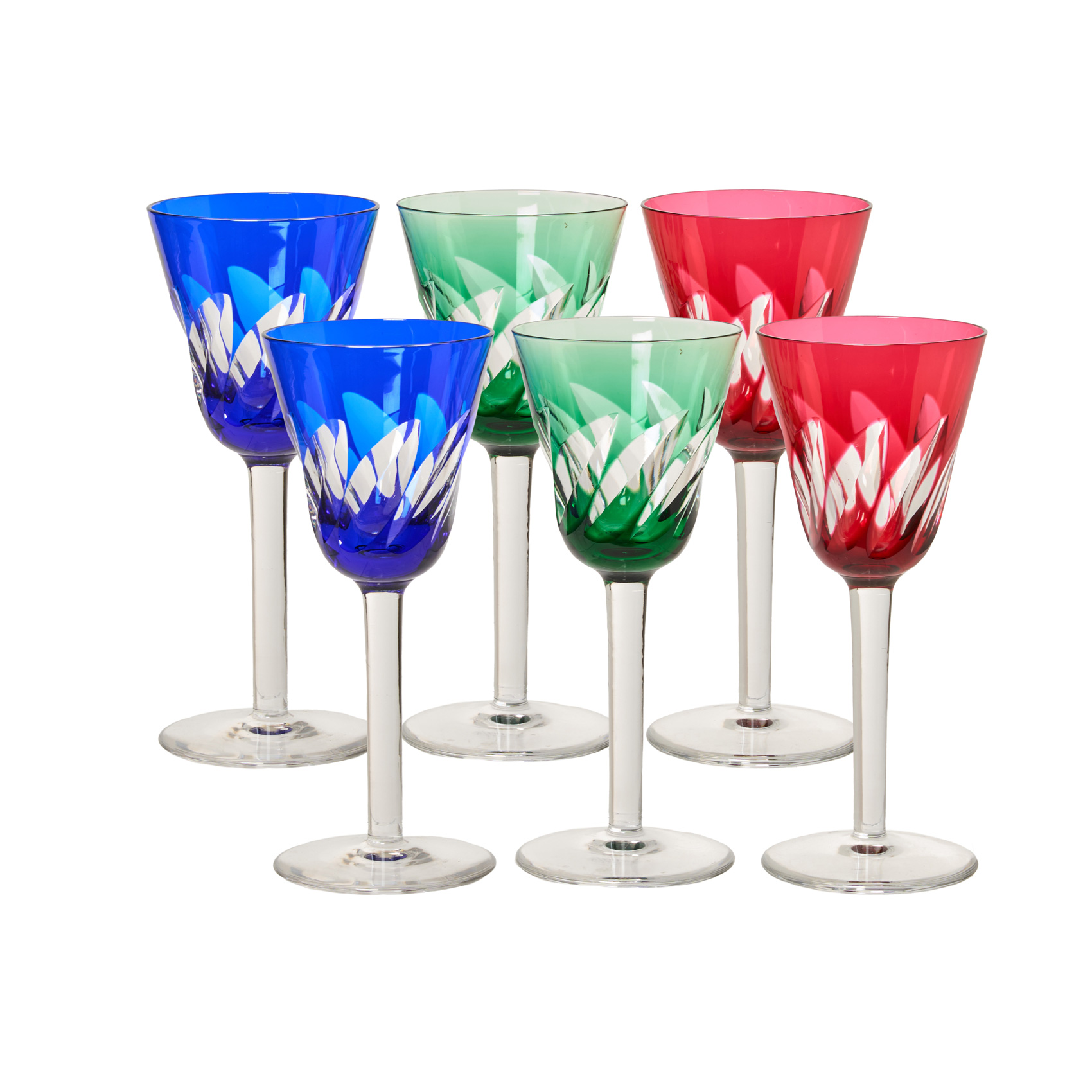 Juego de seis copas de vino en cristal tallado y doblado en diferentes tonalidades con decoración de motivos vegetales, s.XX.