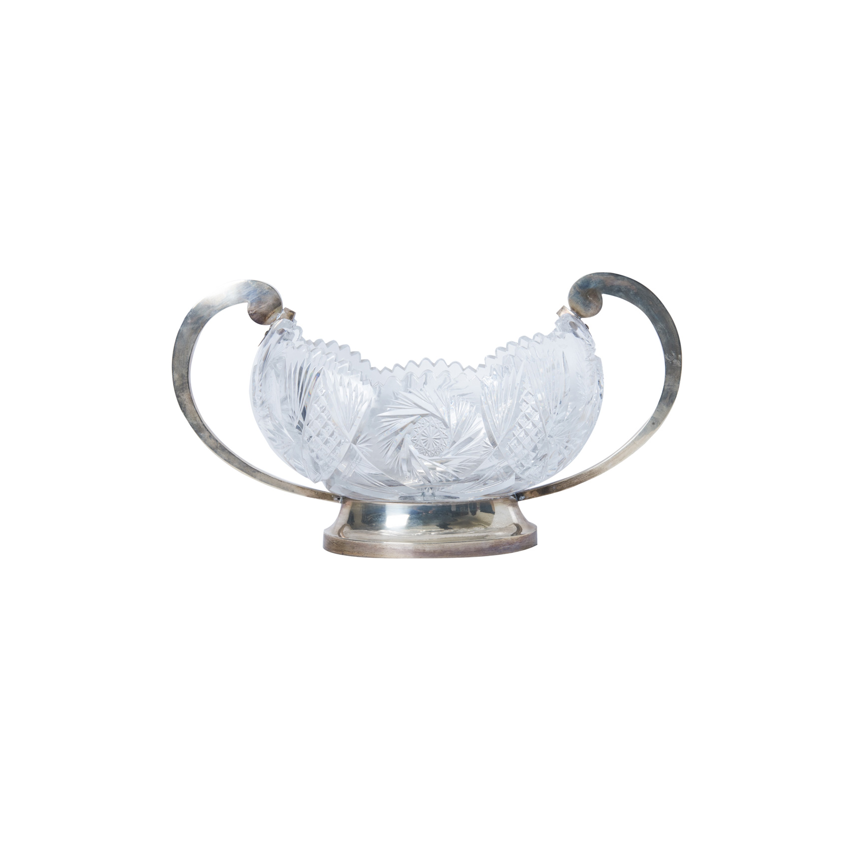 Centro en cristal tallado con base y asas en plata española con punzón Carreras y escudo de Barcelona, c.1900.