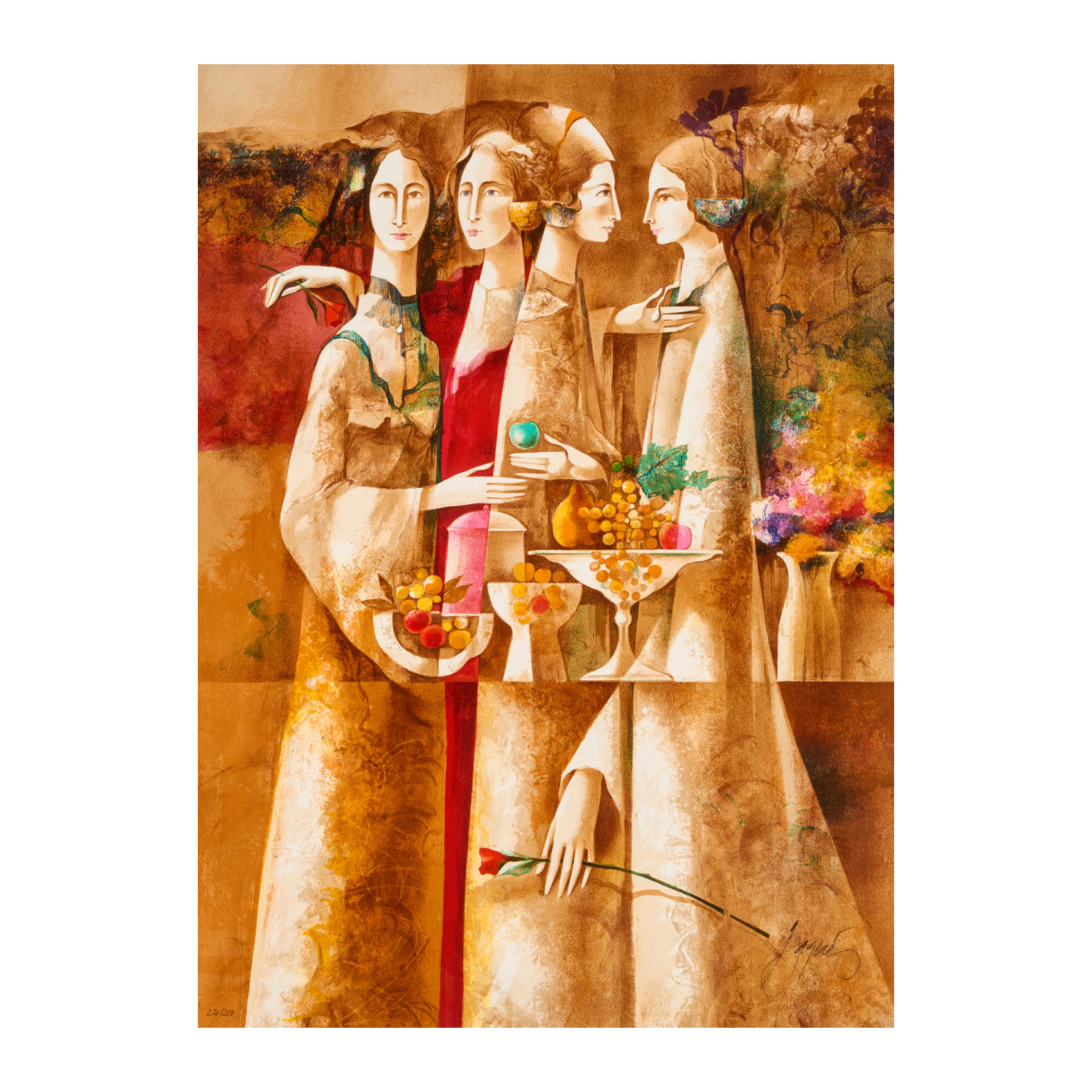 Damas con frutas y claveles.