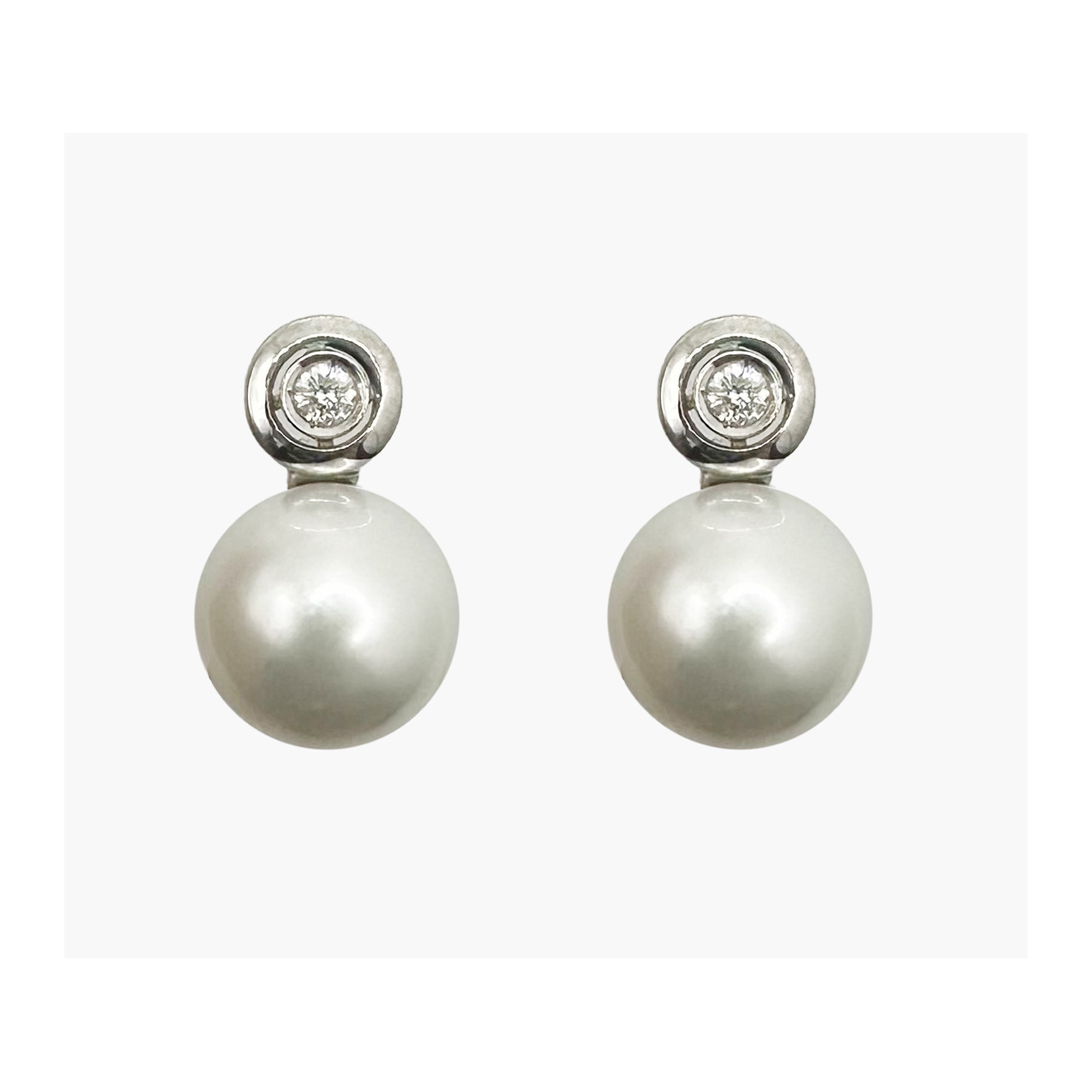 Pendientes tu y yo en oro blanco con perla cultivada australiana de 12,5 mm. y diamante talla brillante engastado en chatón.