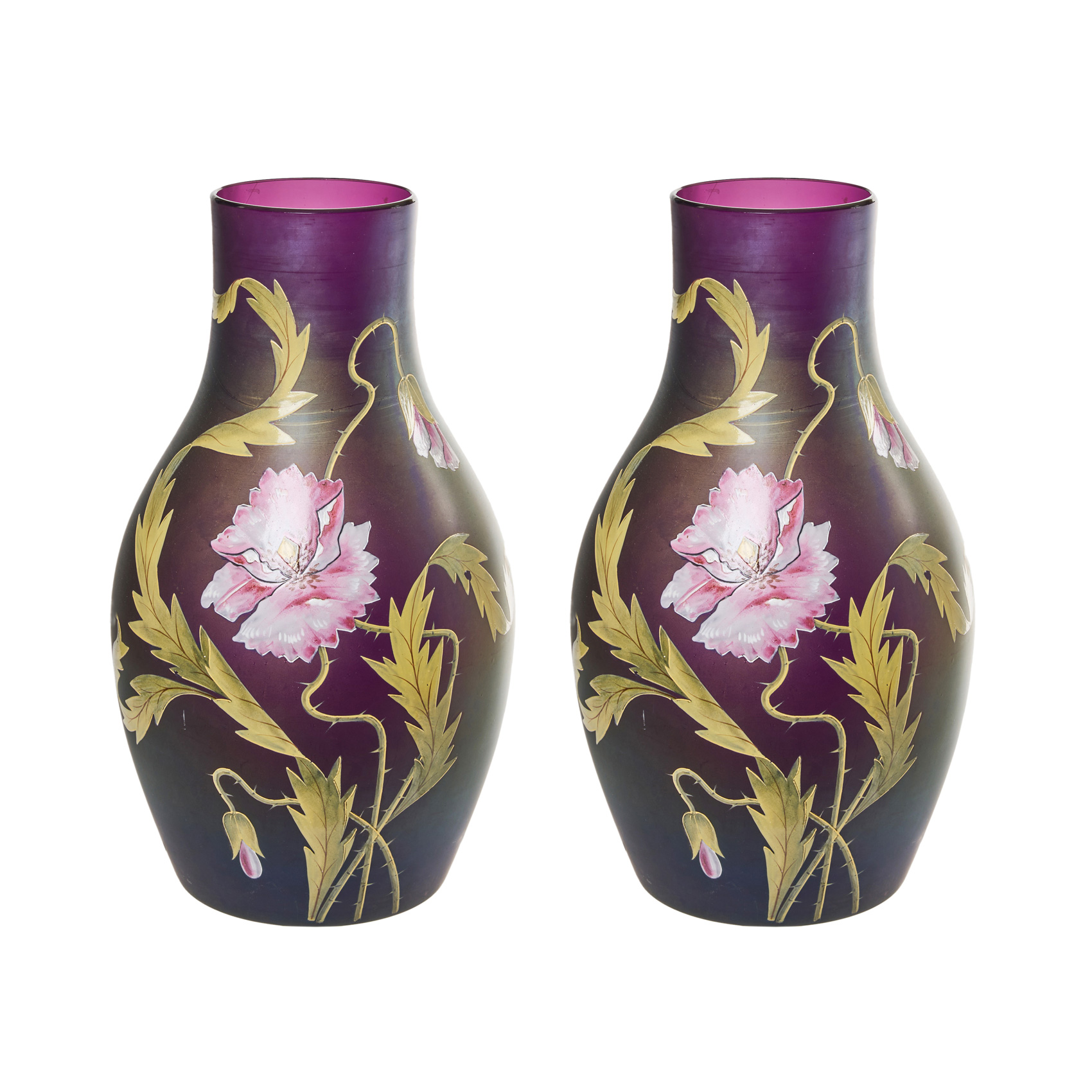 Pareja de jarrones Art Noveau en cristal iridiscente de Bohemia de tonalidad negra-violeta esmaltados al fuego con motivos florales, fles. del s.XIX-ppios. del s.XX.