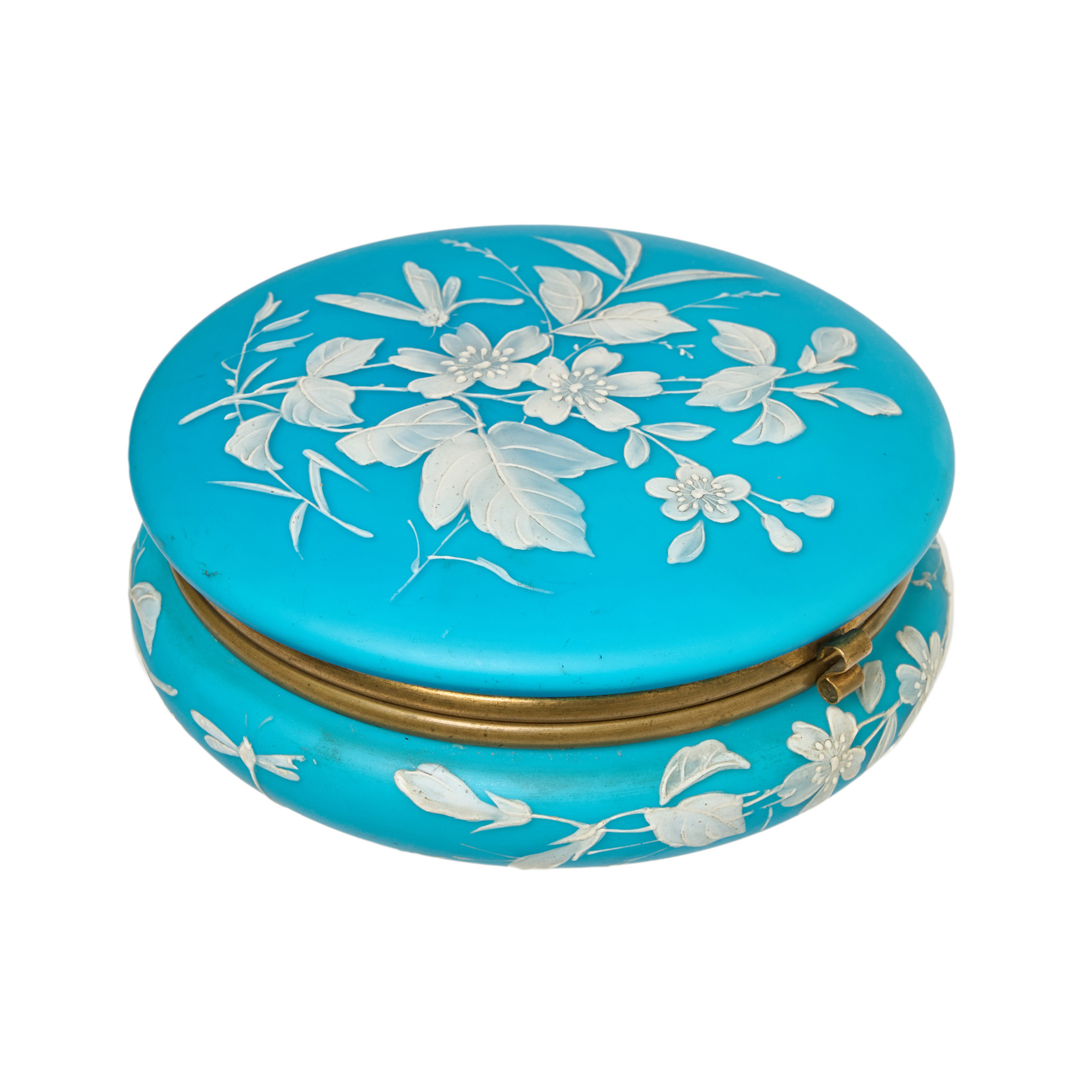 Bombonera inglesa en opalina de tonalidad azul con decoración naturalista pintada al fuego, ppios. del s.XX.