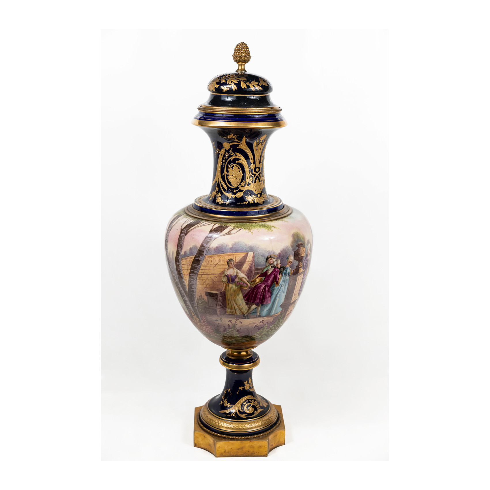 Jarrón francés con tapa estilo Sèvres en porcelana esmaltada y parcialmente dorada sobre base en bronce dorado, s.XIX. Decorado por escena cortesana y paisaje en cuerpo. Firmado Gilly. Presenta marca en la tapa.
