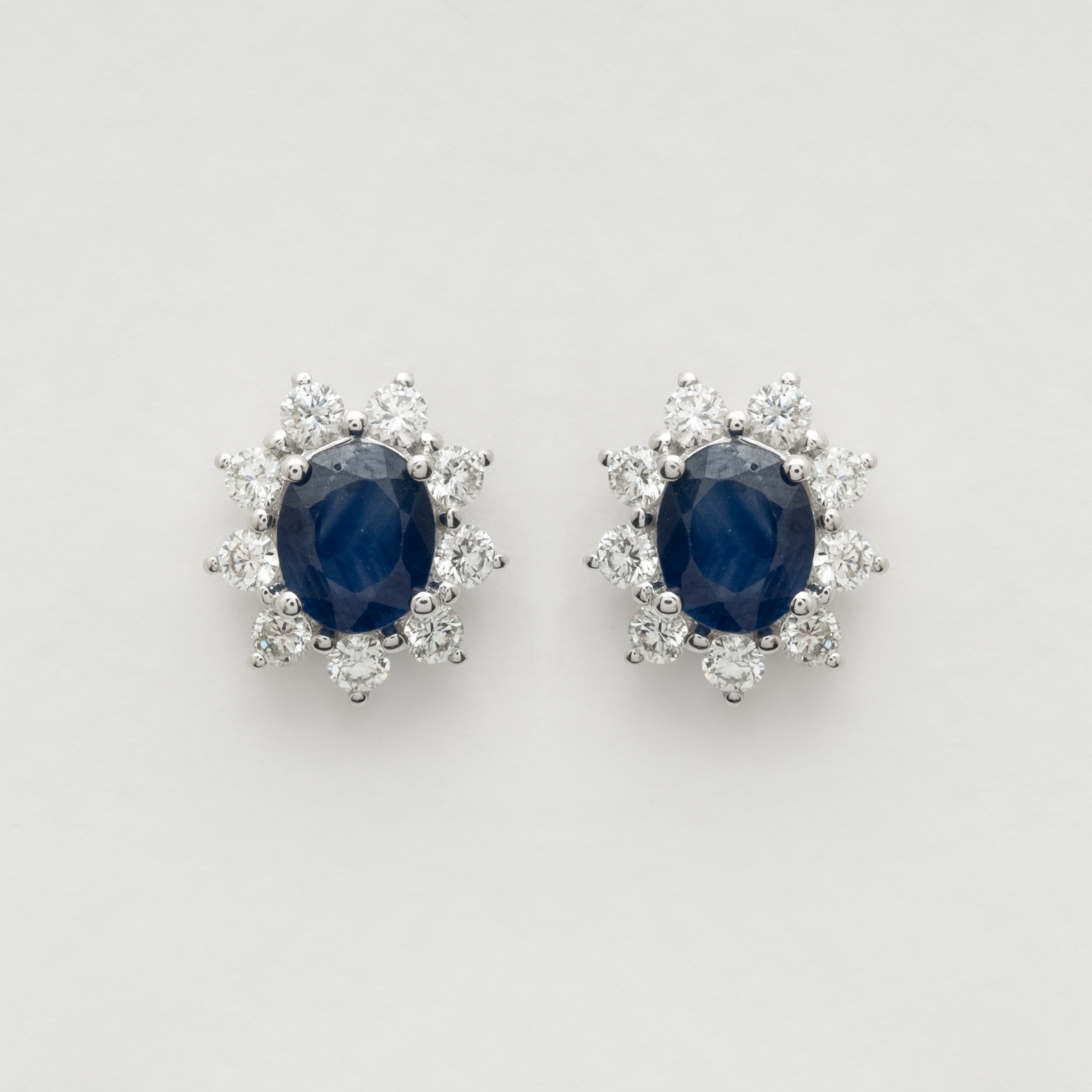 Pendientes rosetón en oro blanco con zafiro azul talla oval orlado por diamantes talla brillante.