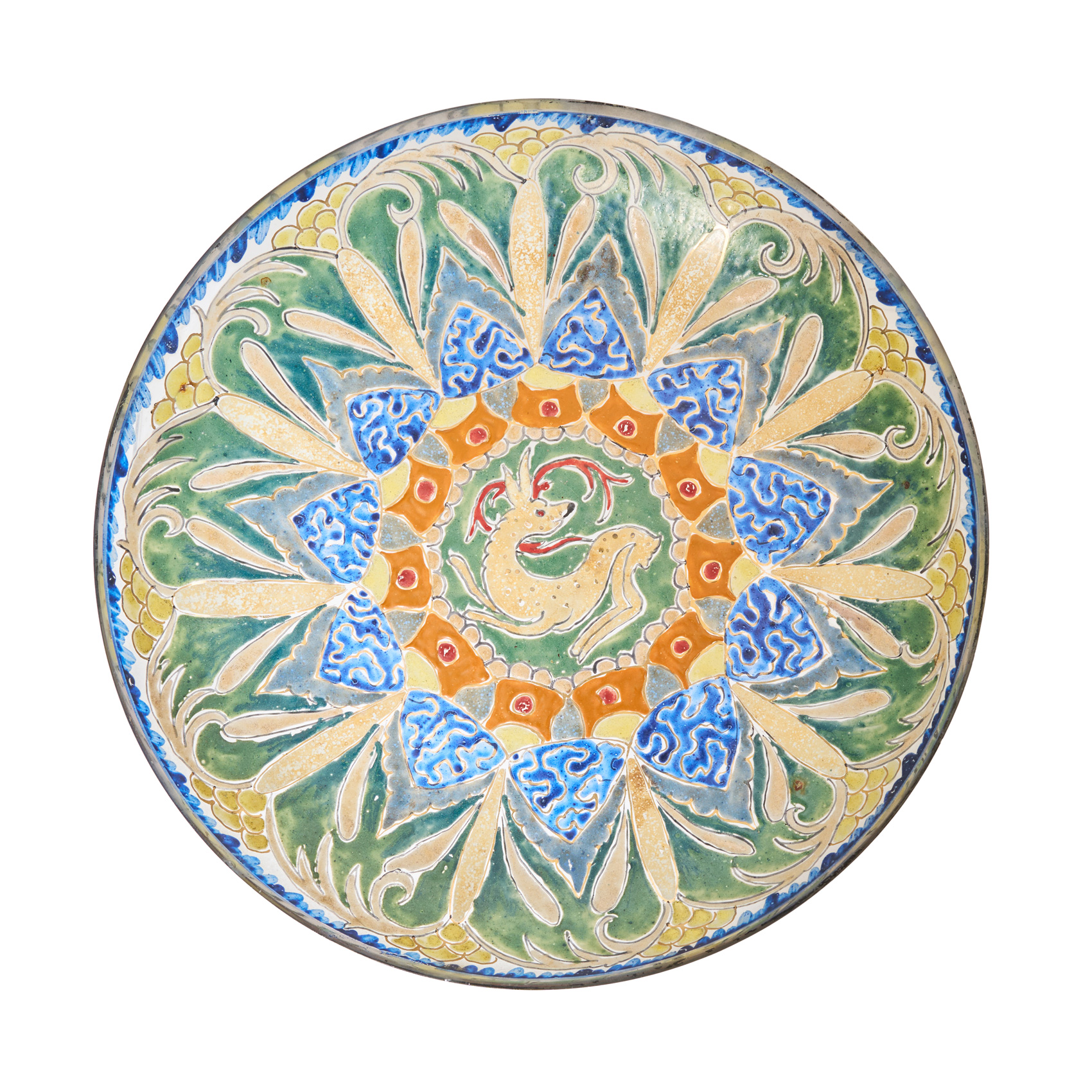 Plato en cristal de tonalidad verde y translúcida con decoraciones geométricas y de motivos zoomorfos esmaltadas al fuego. Firmado.