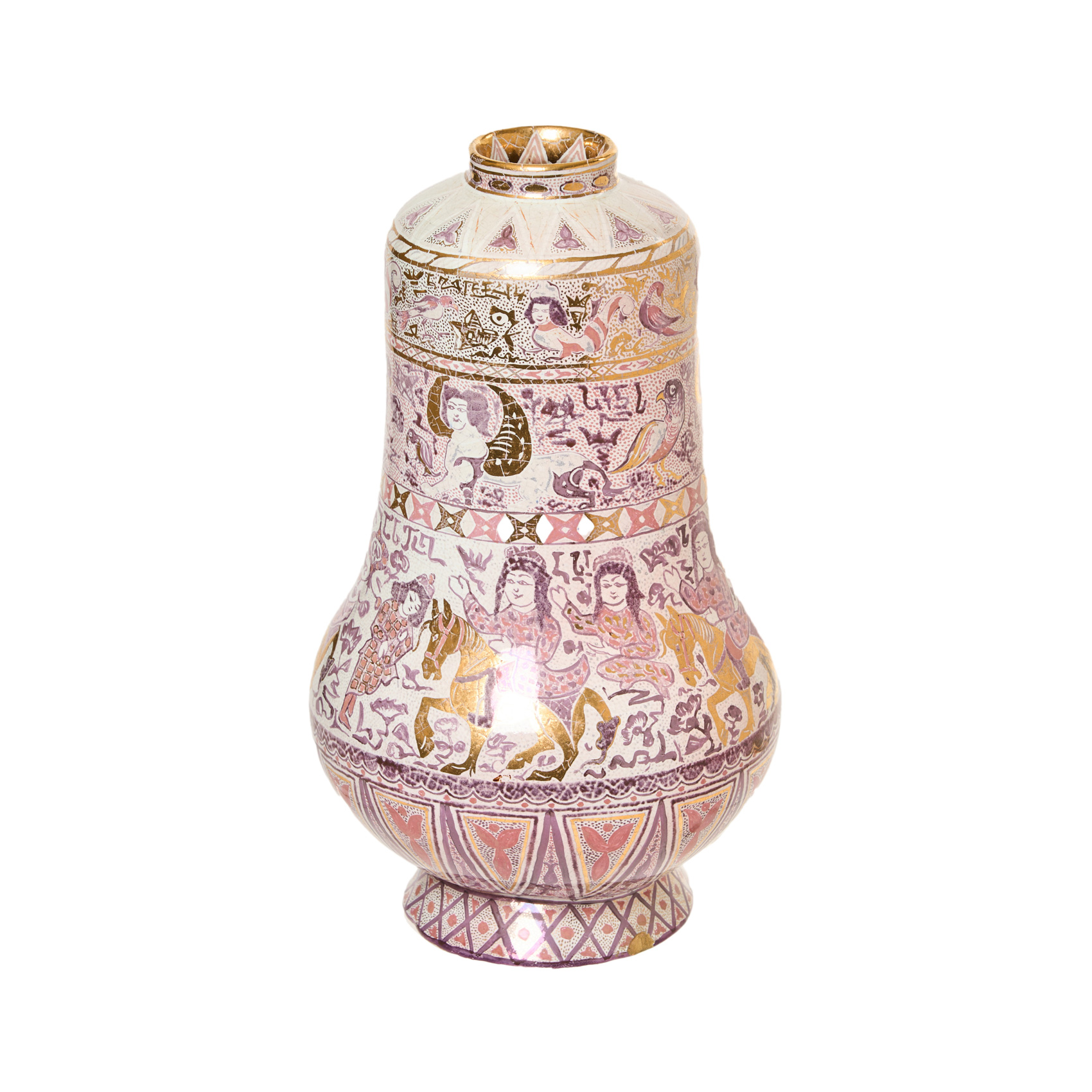 Jarrón en cerámica esmaltada y dorada con decoración de motivos de oriente medio. Firmado en la boca y en la base.