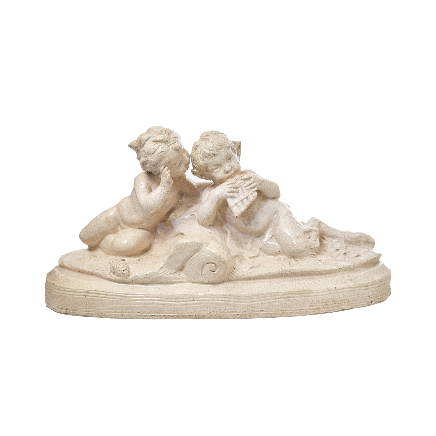 Sátiros. Escultura en pocelana española esmaltada, s.XX. Firmado Conil.