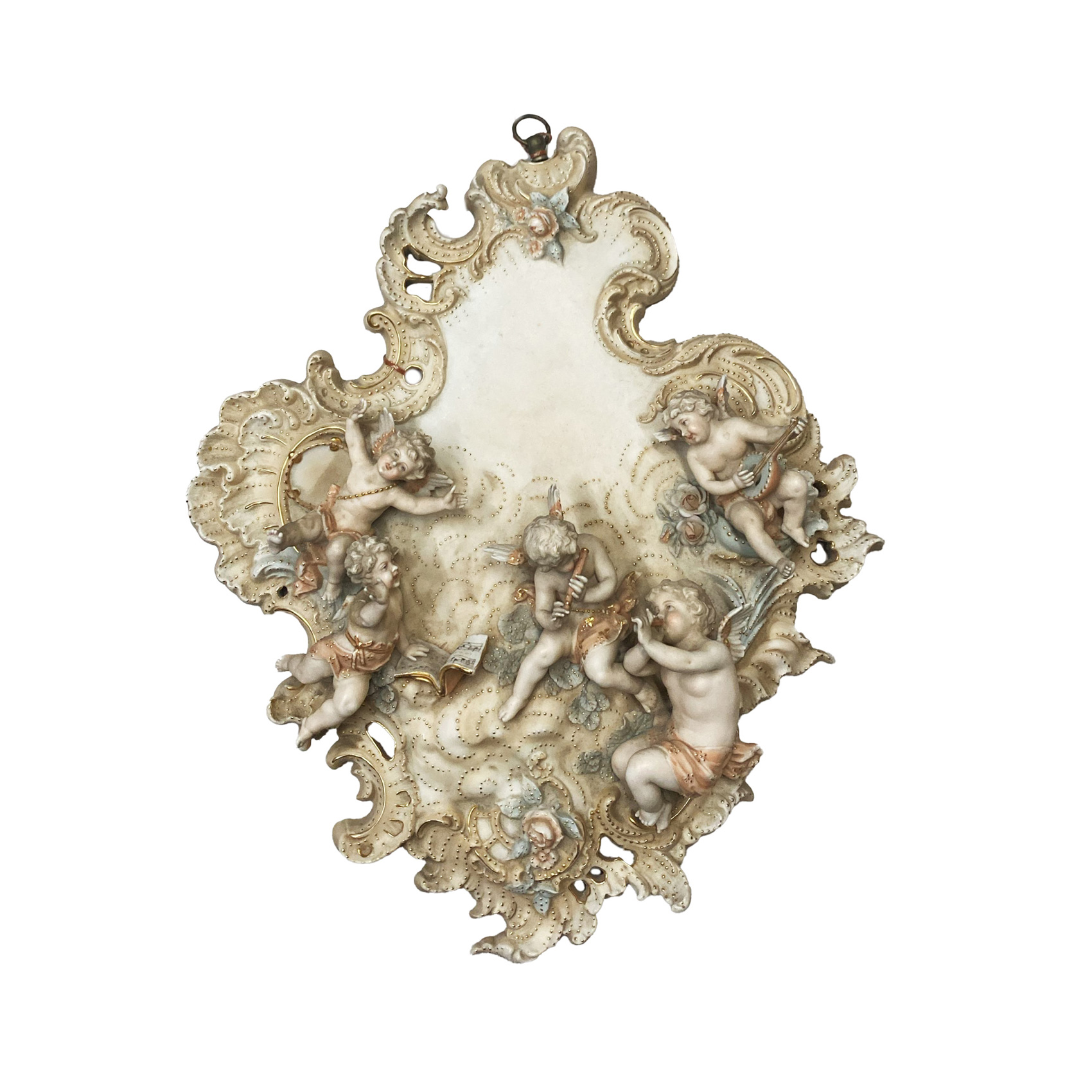 Aplique de pared en biscuit policromado con decoración de querubines músicos, roleos, rocallas y motivos florales en relieve con realces en dorado, s.XX. Etiqueta de origen en trasera.