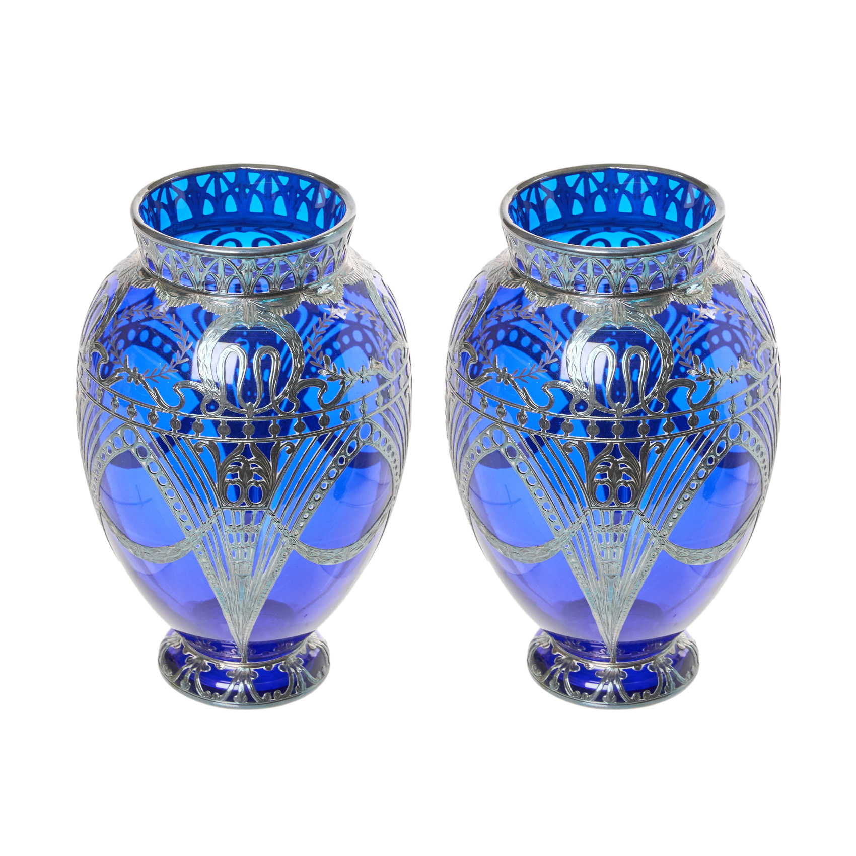 Pareja jarrones ovoides en cristal de tonalidad azul cobalto con aplicaciones en nitrato de plata de motivos Art Noveau, ppios. del s.XX.