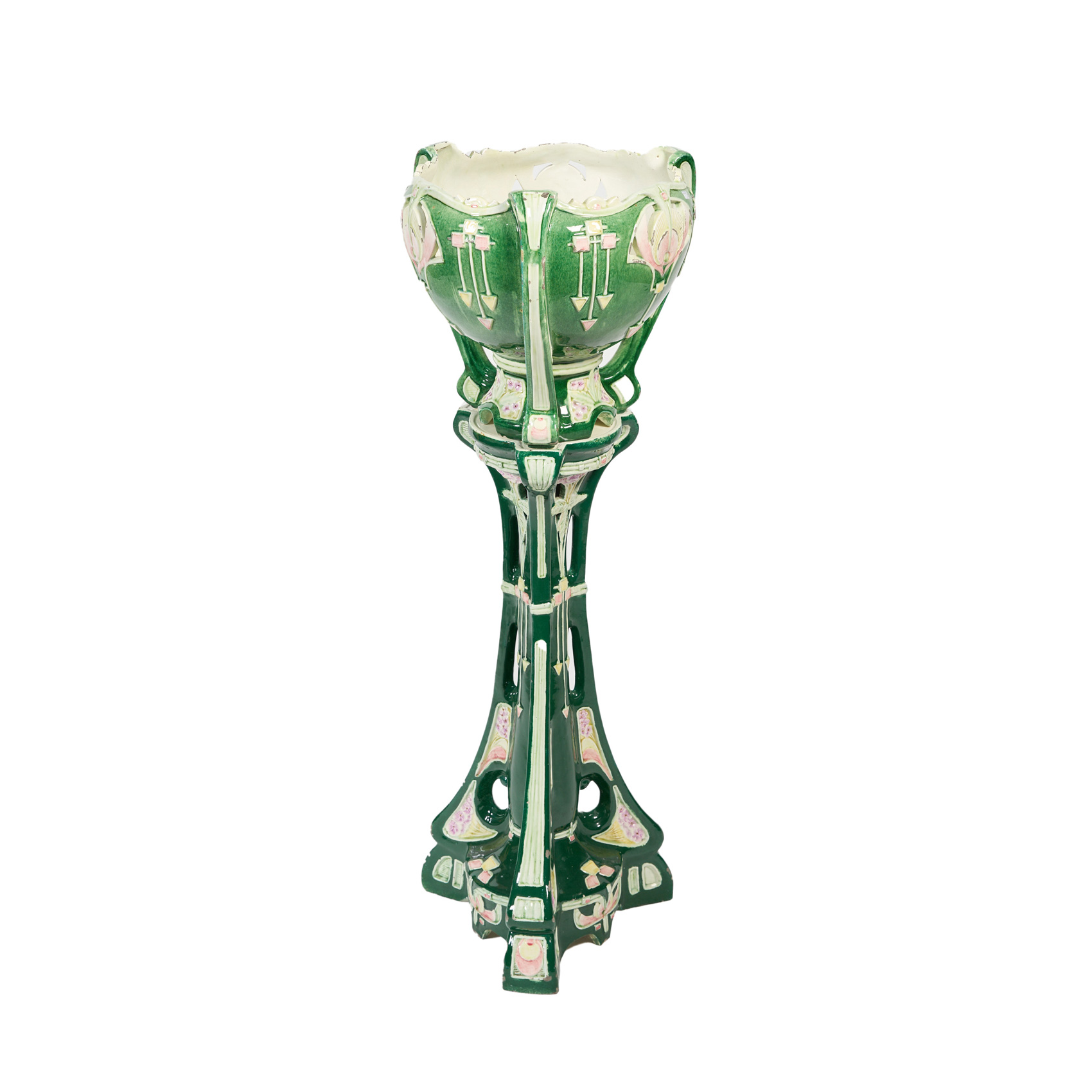 Jardinera con pie en cerámica esmaltada de tonalidades verde, rosa y amarilla con decoraciones de motivos vegetales, de flechas y de motivos geométricos, s.XX.