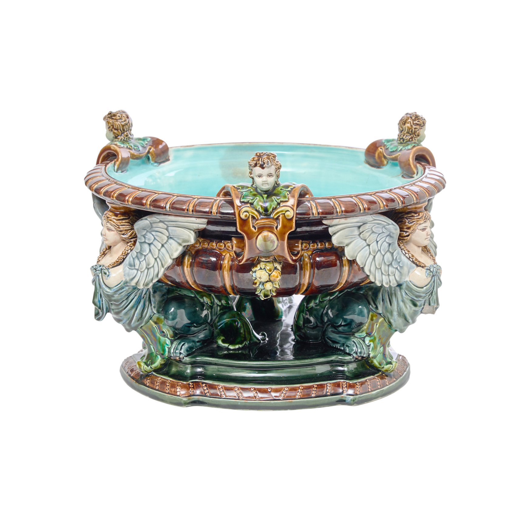 Centro en mayólica esmaltada con decoración en relieve de motivos vegetales, rostros de infantes y arpías, fles. del s.XIX.