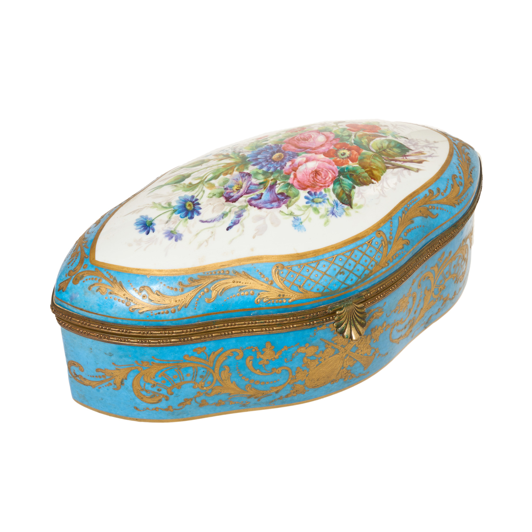 Caja en porcelana francesa esmaltada de estilo Sèvres con decoraciones florales esmaltadas en cartelas sobre fondo azul y fileteados al oro fino, fles. del s.XIX. Marcas en la base.