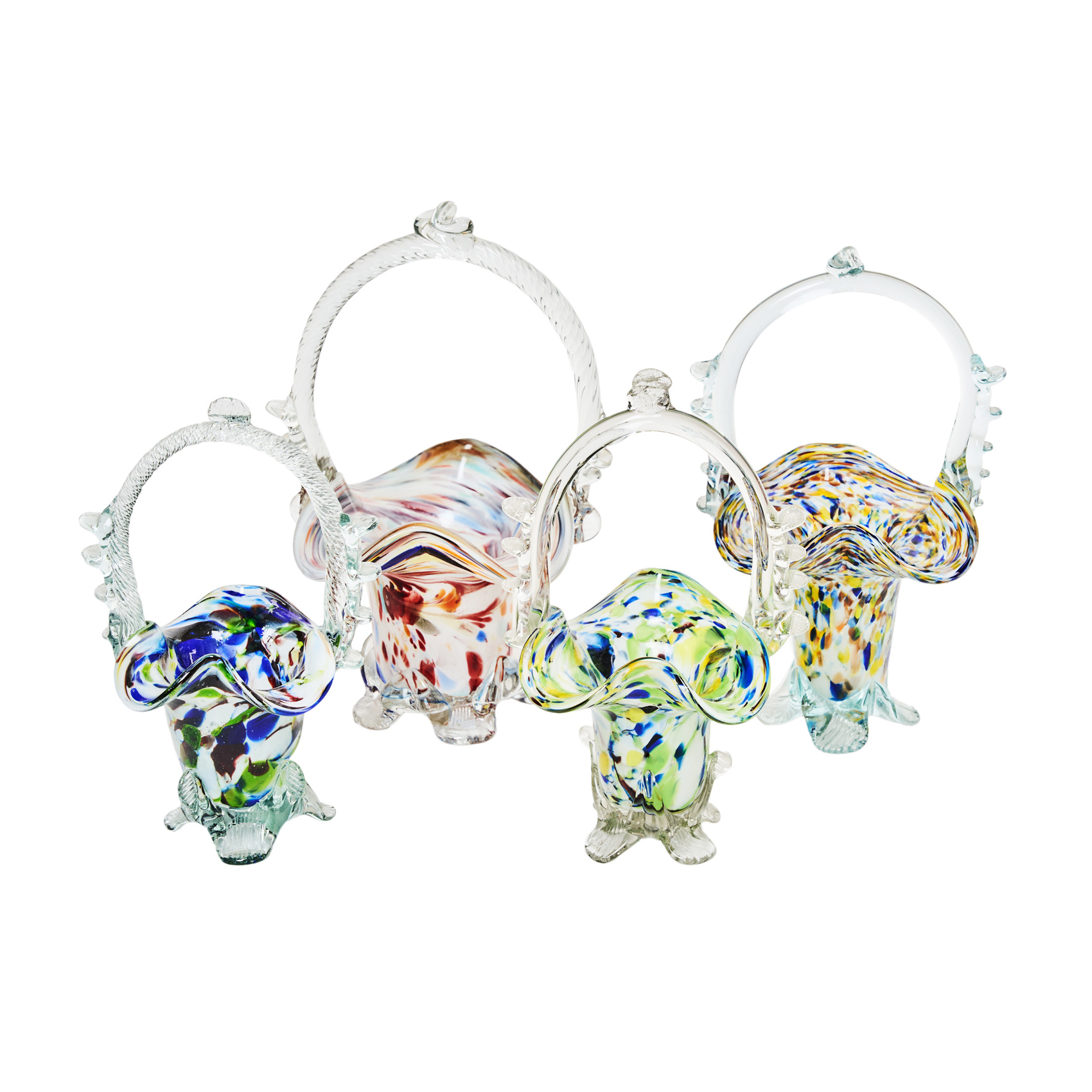 Lote de por cuatro cestas en cristal de Murano con moteado en diferentes tonalidades, s.XX.