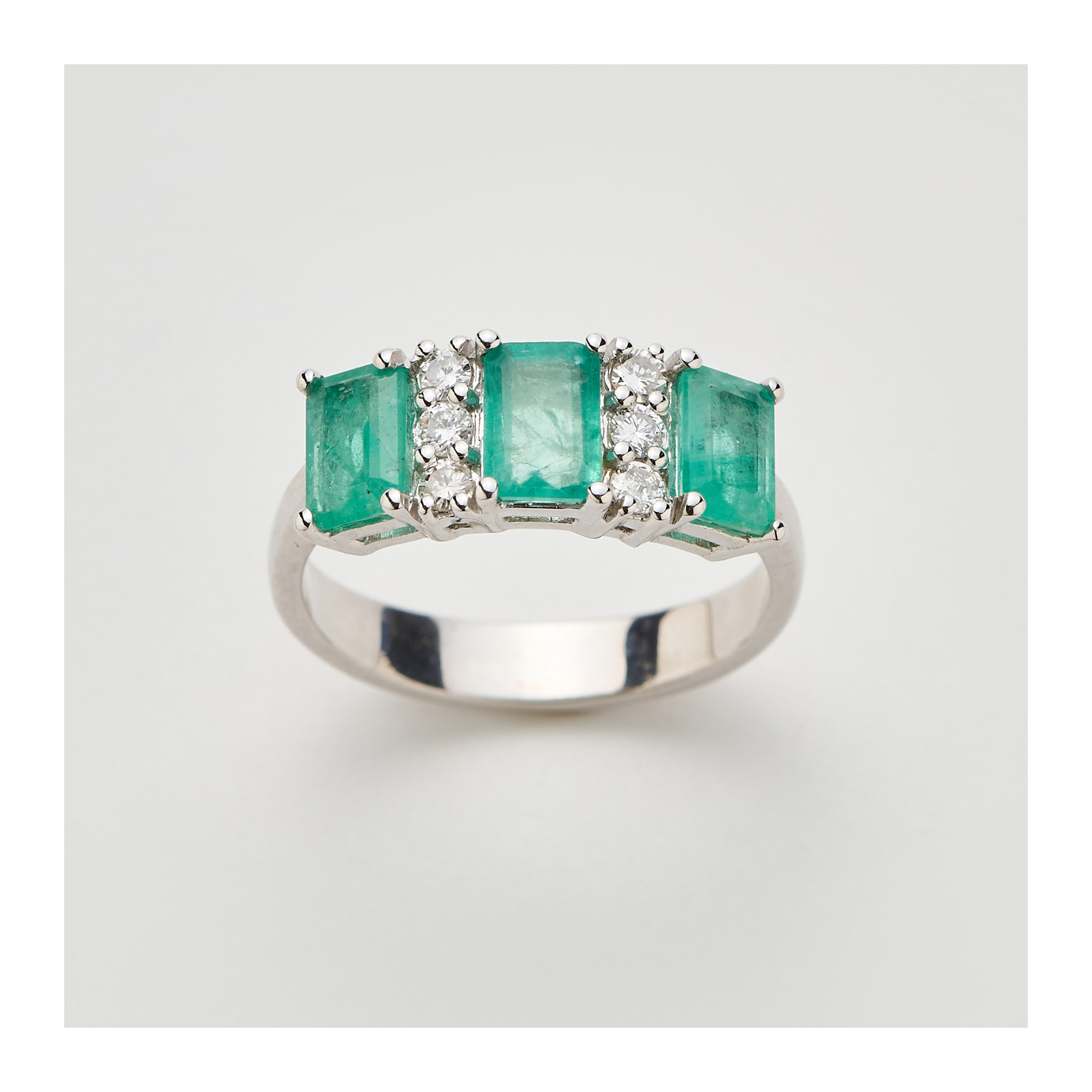 Sortija en oro blanco con tres esmeraldas rectangulares y dos bandas de diamantes talla brillante alternadas.