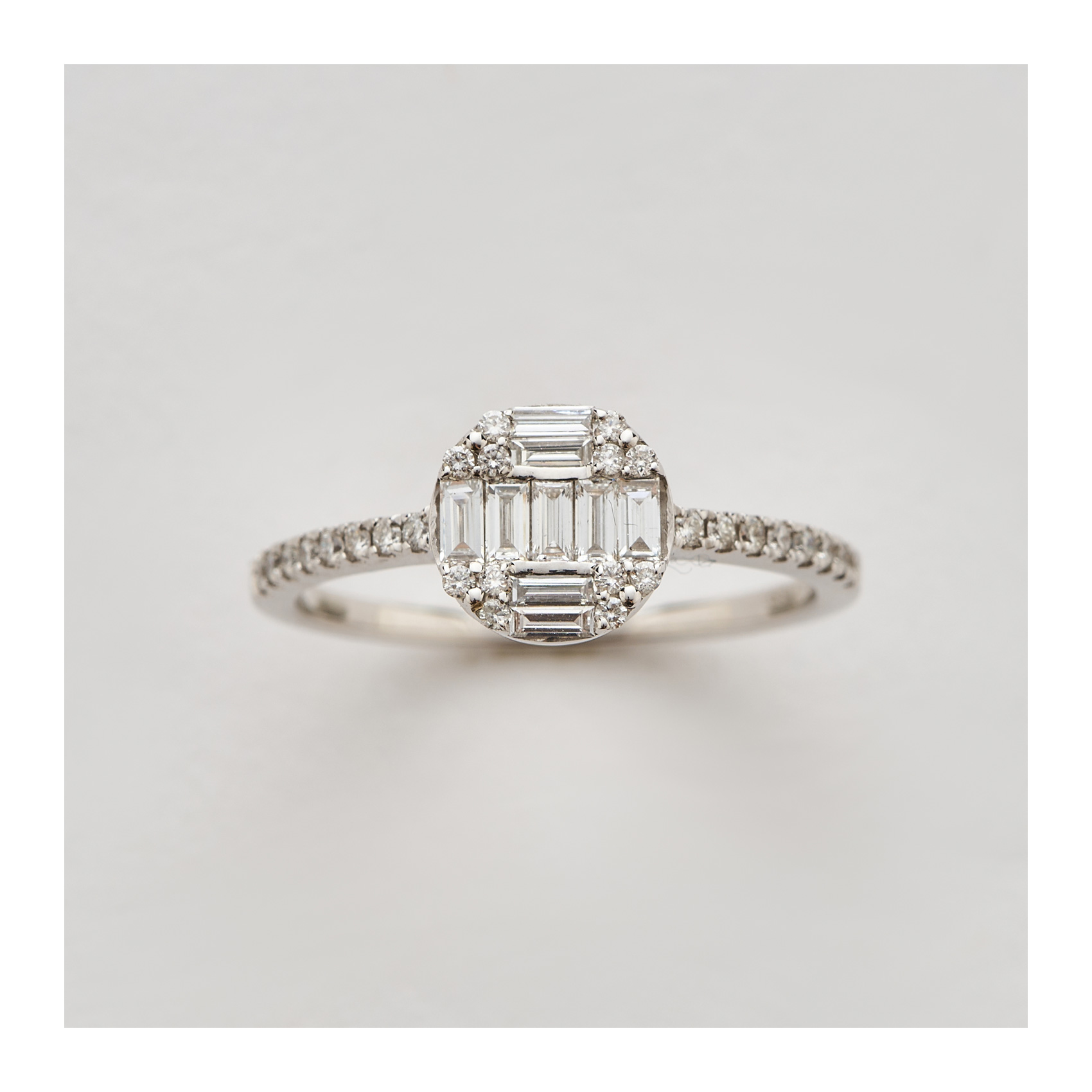Sortija en oro blanco con centro circular y brazos de diamantes tallas brillante y baguette.
