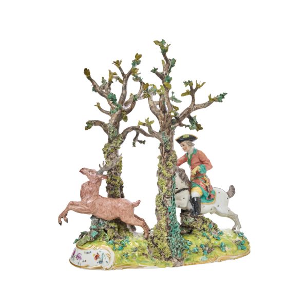 Escena de caza. Grupo en porcelana alemana esmaltada, s.XIX. Marcas en la base.