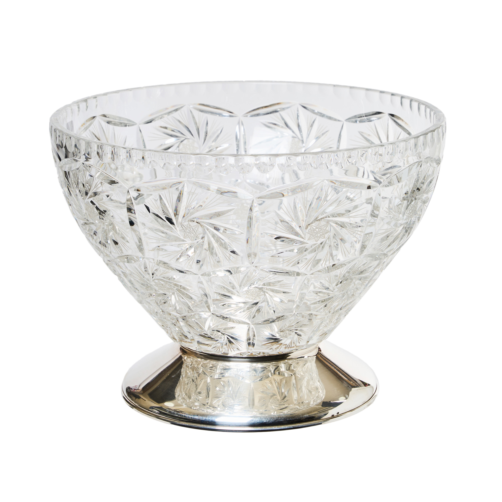 Centro en cristal de tonalidad translúcida con decoración de motivos florales tallados y pie en plata punzonada, s.XX.