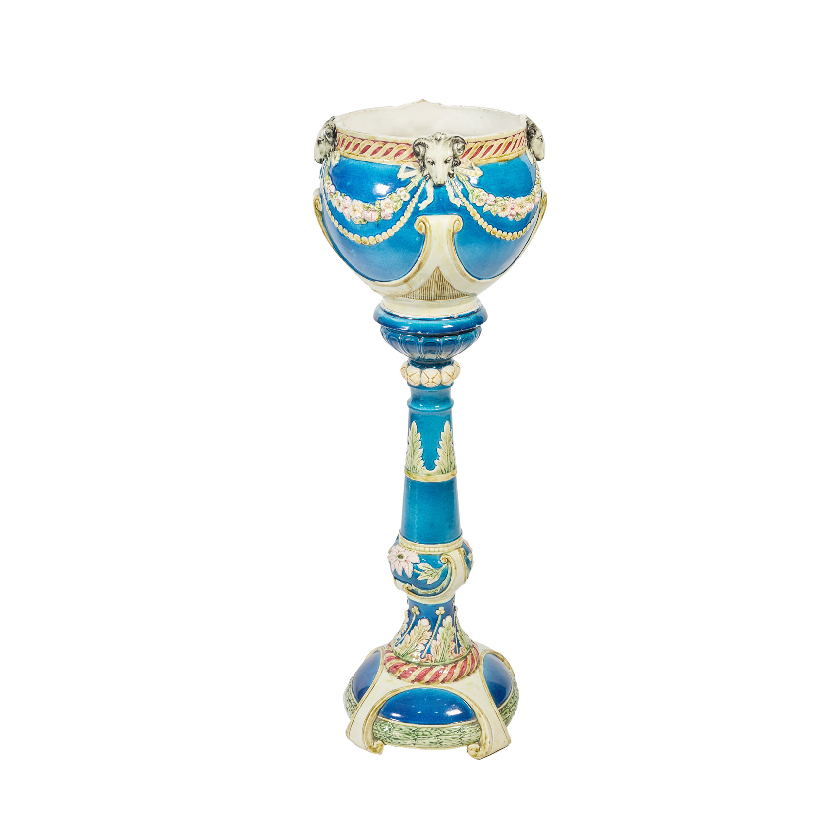 Macetero modernista en cerámica de mayólica decorado por girnaldas florales y testas de chivo, ppios. del s.XX. Apoya sobre pedestal.