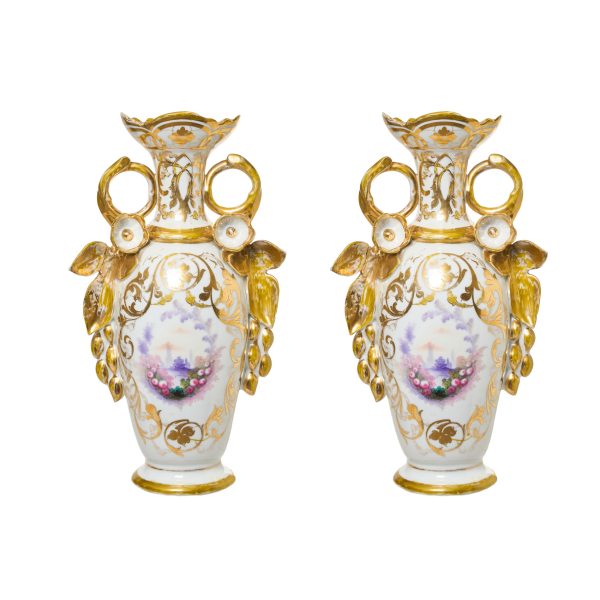 Pareja de jarrones isabelinos en porcelana esmaltada blanca con realces en dorado y paisaje polícromo en reserva en el anverso, segunda mitad del s.XX. Asas con motivos florales y vegetales en relieve.