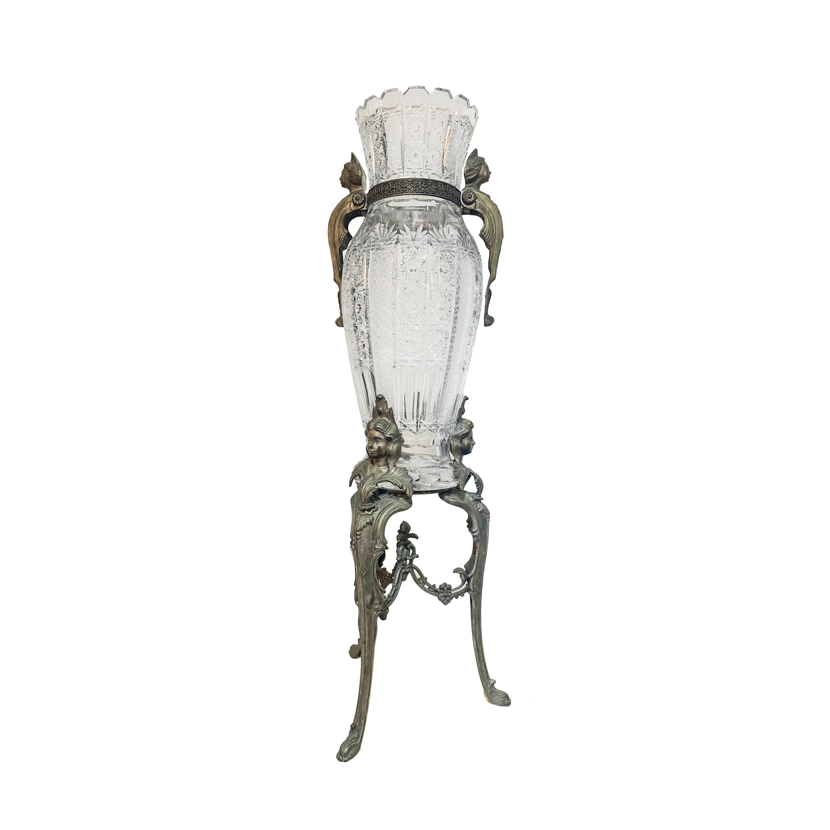 Jarrón en cristal tallado con decoración de punta de diamante sobre soporte en metal con decoración de esfinges en los ángulos, s.XX.