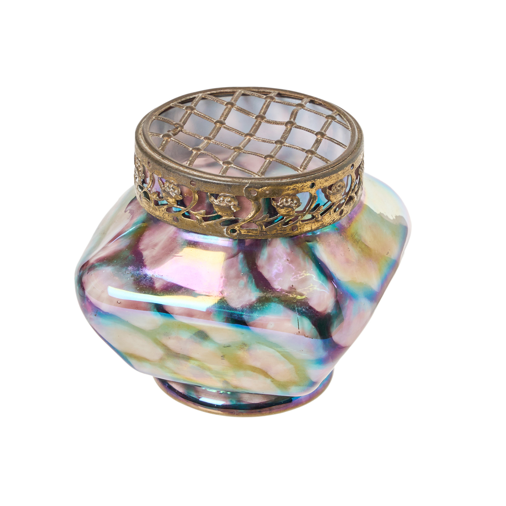 Violetero en cristal iridiscente con aplique en latón calado en la boca, ppios. del s.XX.